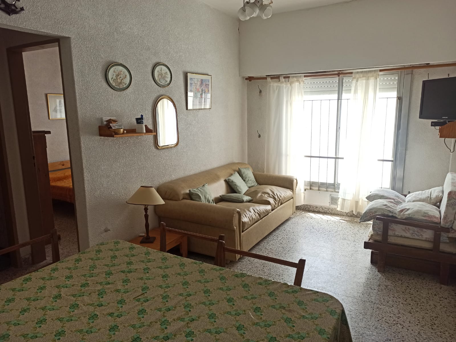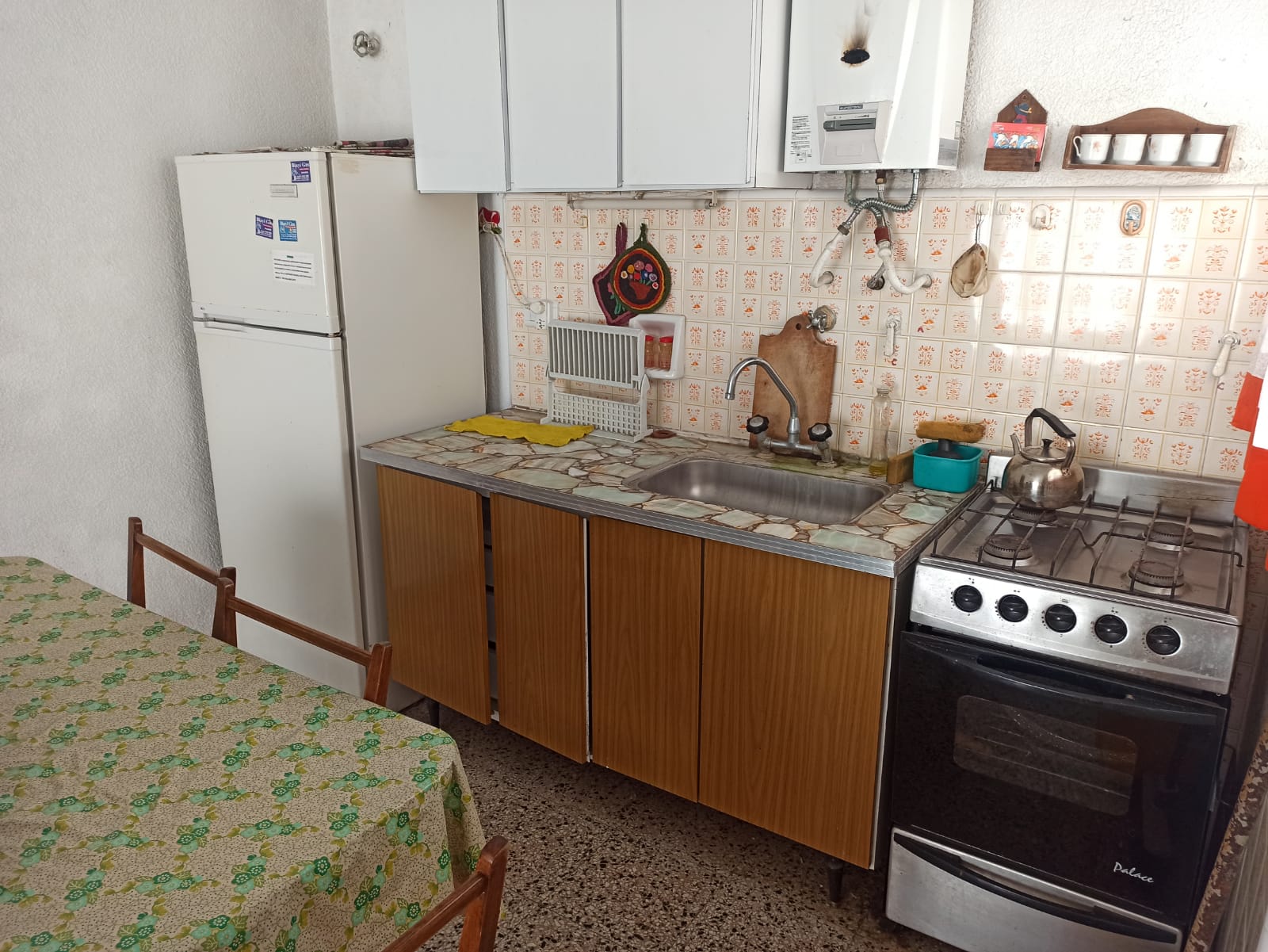 Departamento de 2 ambientes en 1er piso por escalera. Consta de Cocina-comedor con sofa cama, 1 baño, 1 dormitorio con 1 cama matrimonial y terraza privada con parrilla. Cuenta con 1 Tv con cable, Wifi recargable, heladera con freezer, 2 ventiladores y gas envasado (a cargo inq). Acepta mascotas.
