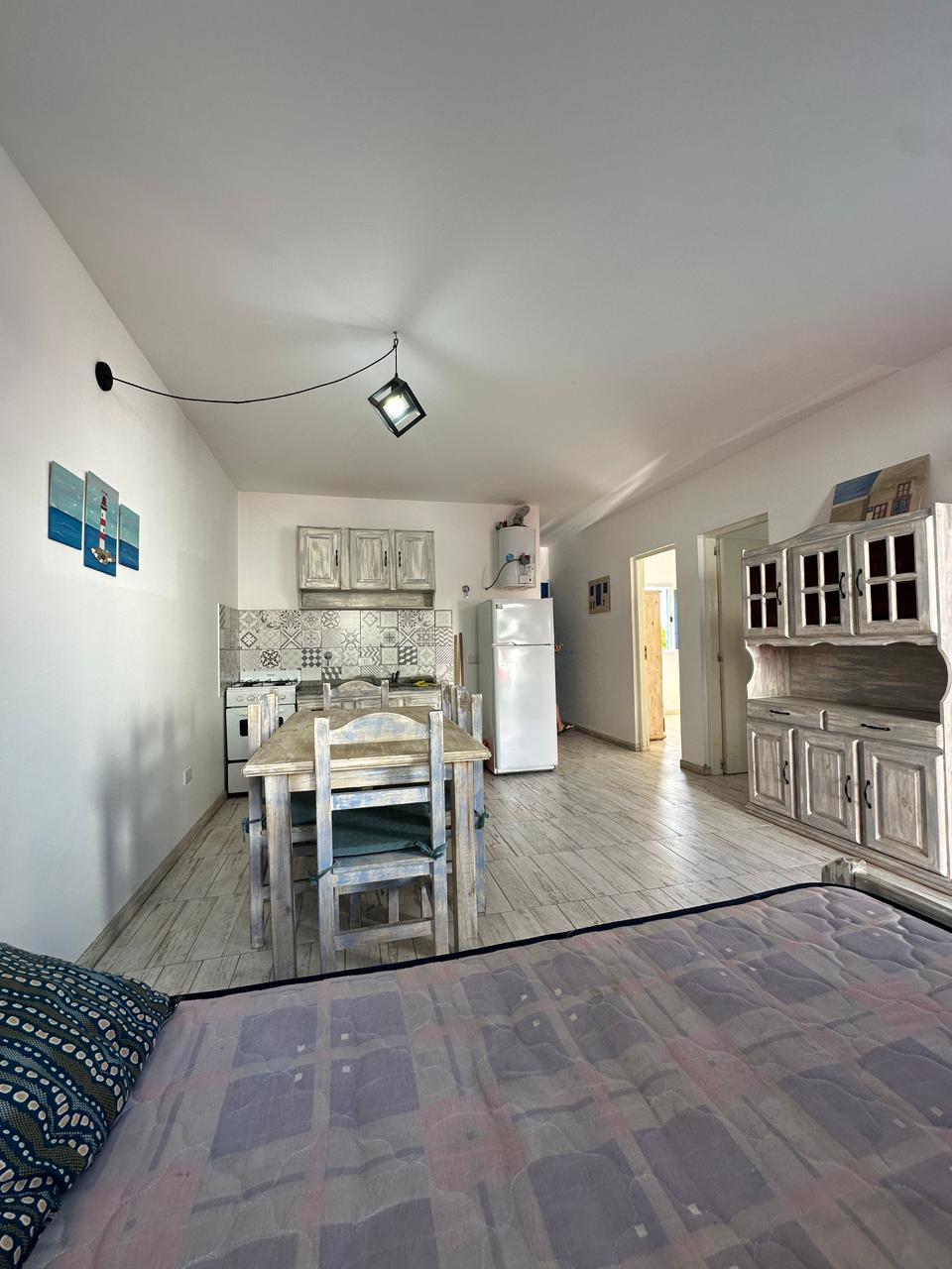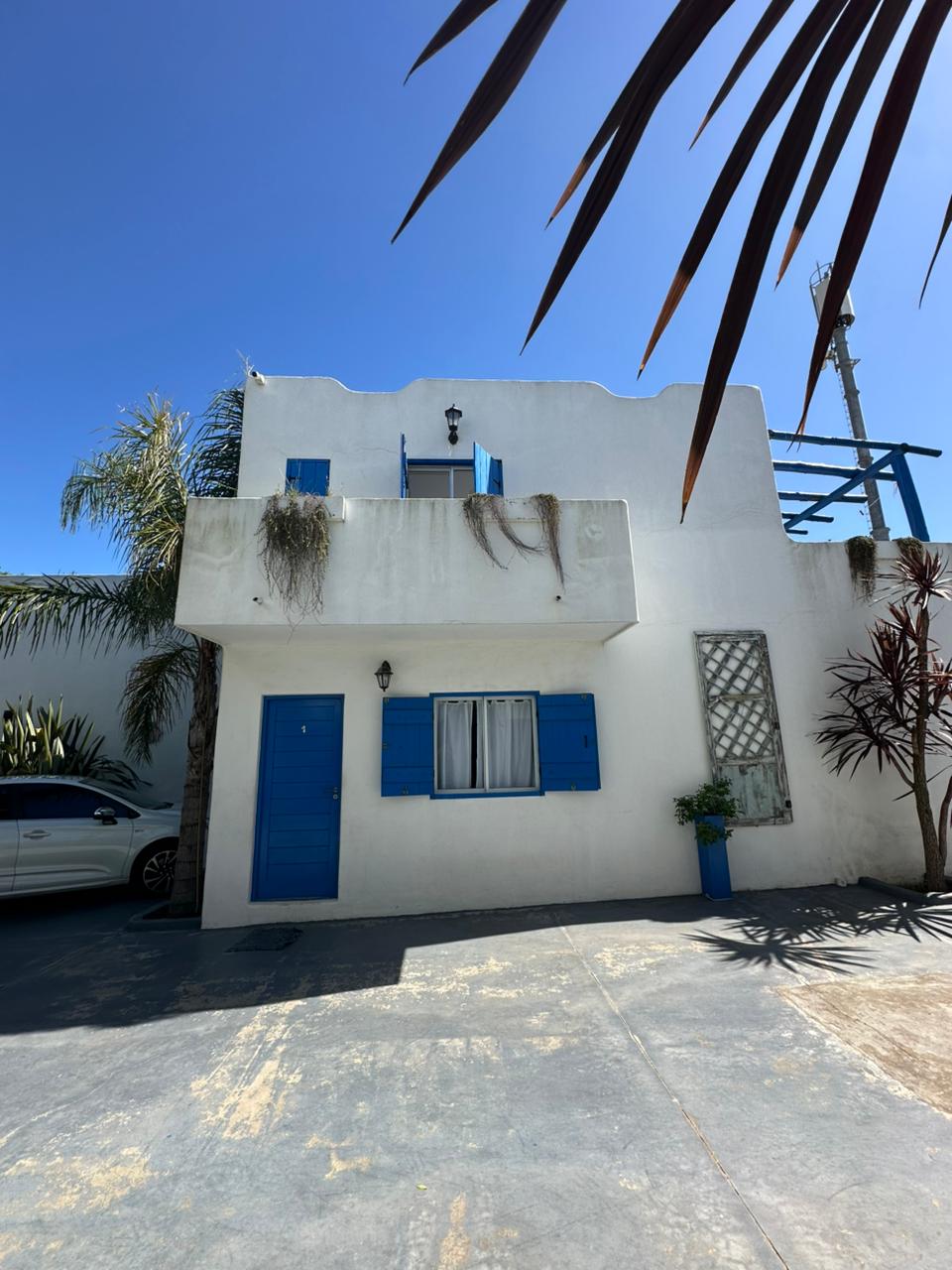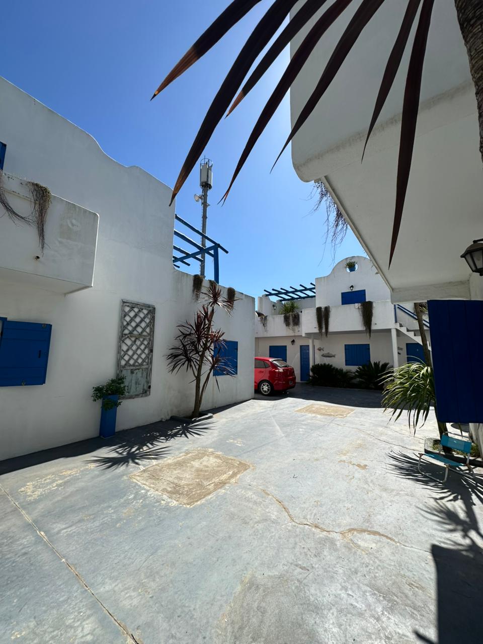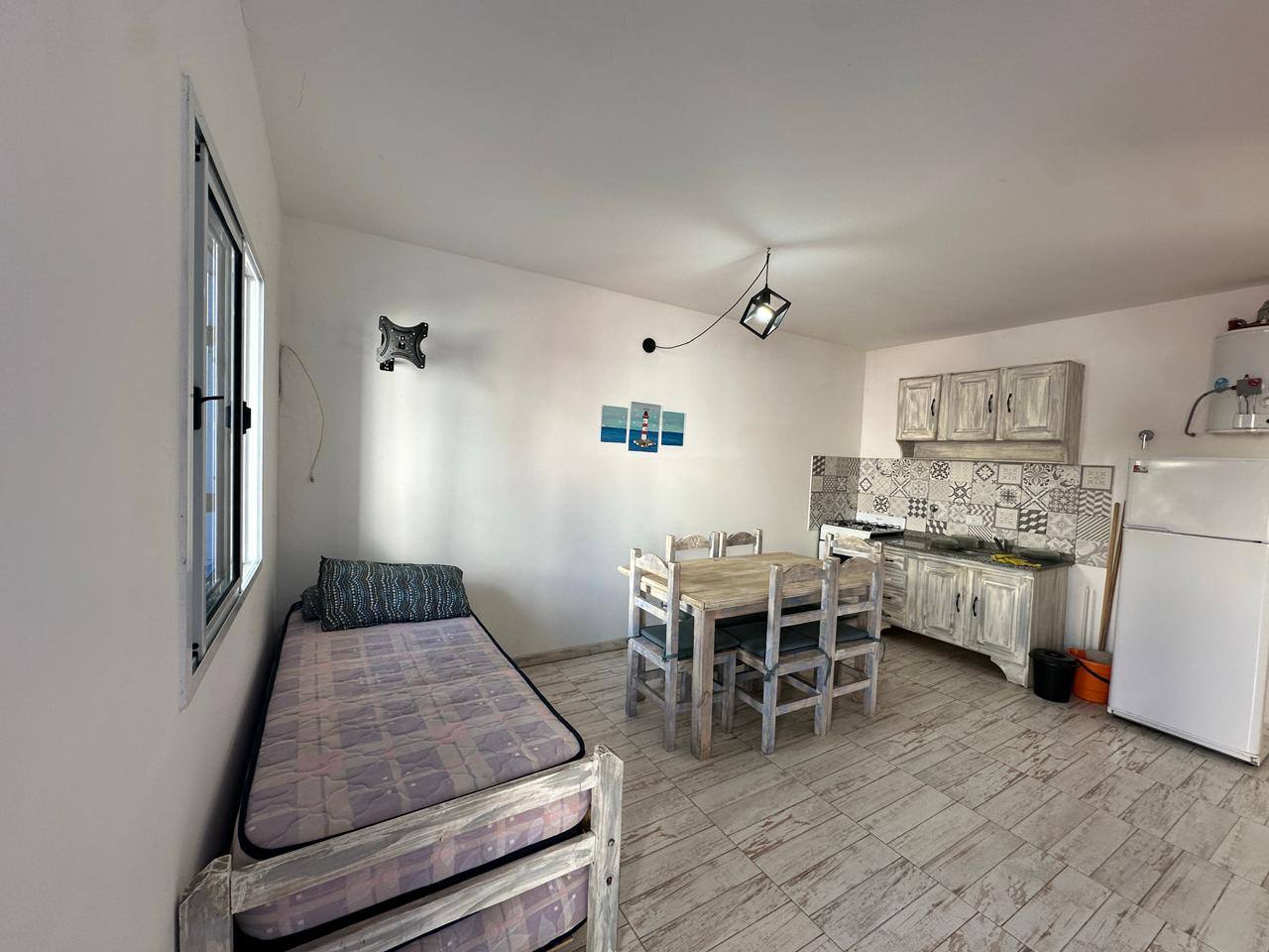 Departamento en PB; Complejo de arquitectura con inspiración en las costas mediterráneas del mar Egeo. 3 ambientes, cocina-comedor con mesada, bajo mesada, bacha de acero inoxidable. Cuenta con dos habitaciones,dormitorio matrimonial con cama de 2 plazas. Seguido de baño completo con ducha, bidet e inodoro, recubierto con azulejos en un estilo pixel art moderno. Siguiente habitación con 2 camas cuchetas y ventana con vista al complejo. Patio con verde Cerrado por los costados con paredones de 2.5M y parrilla.