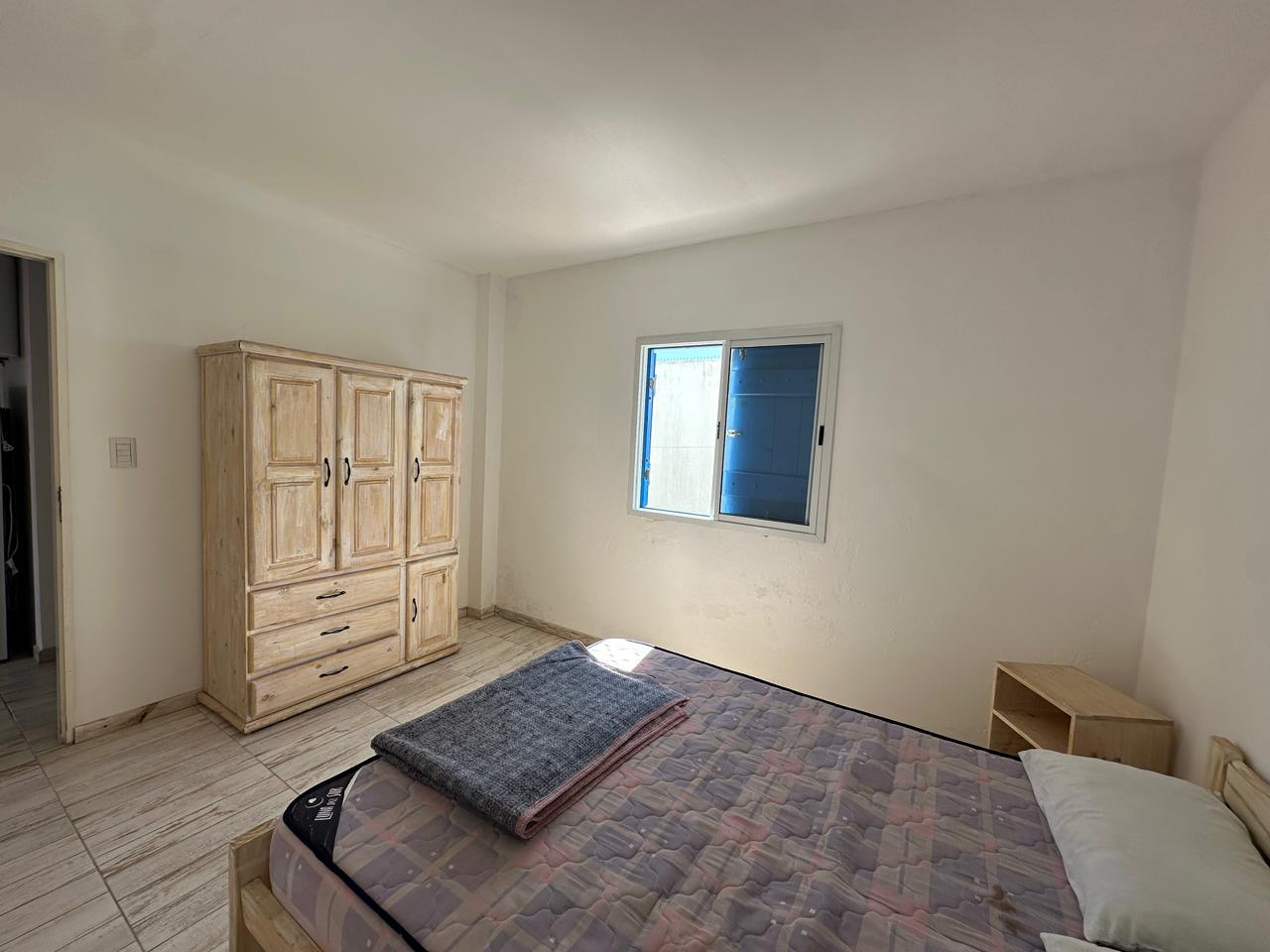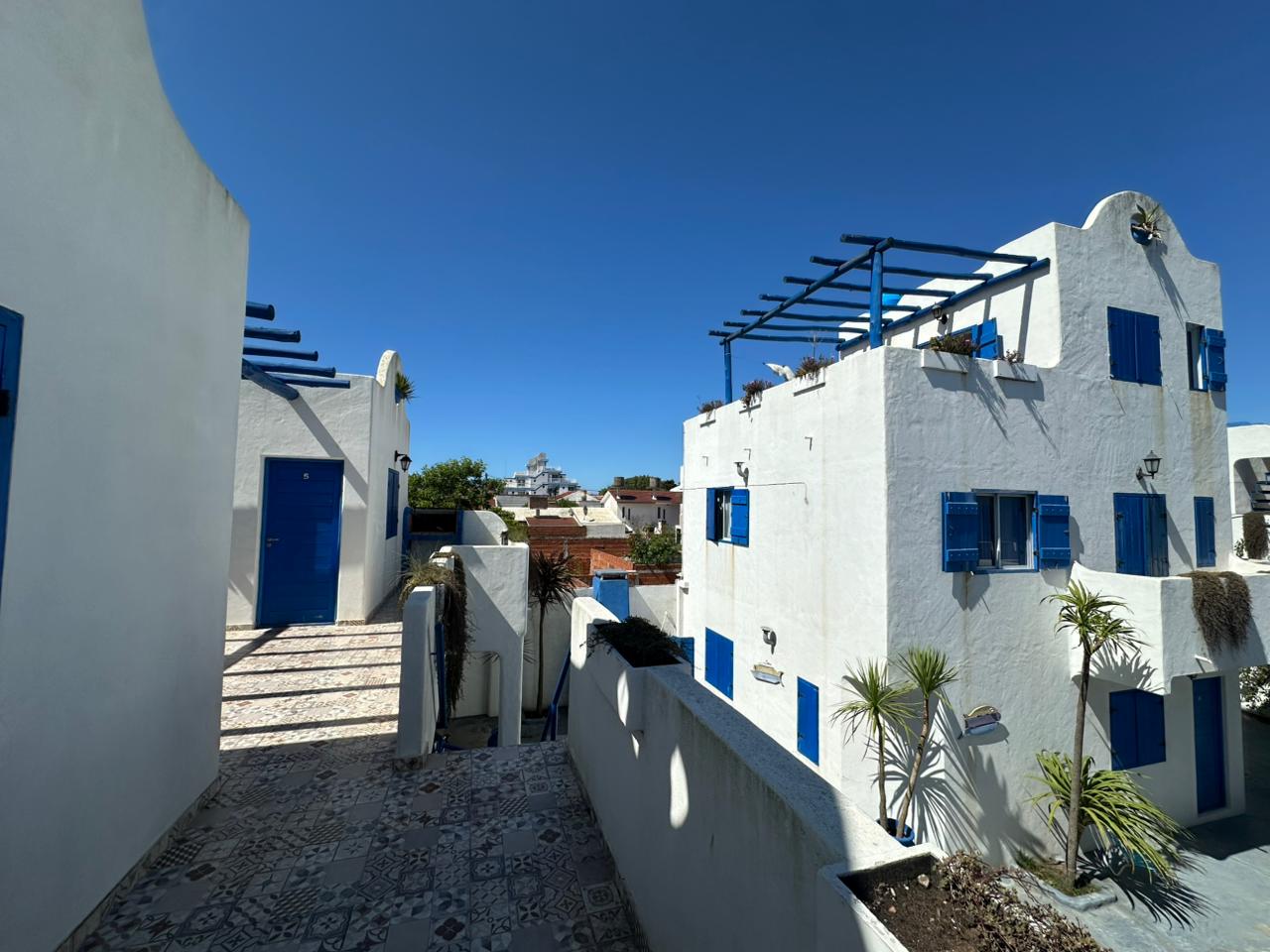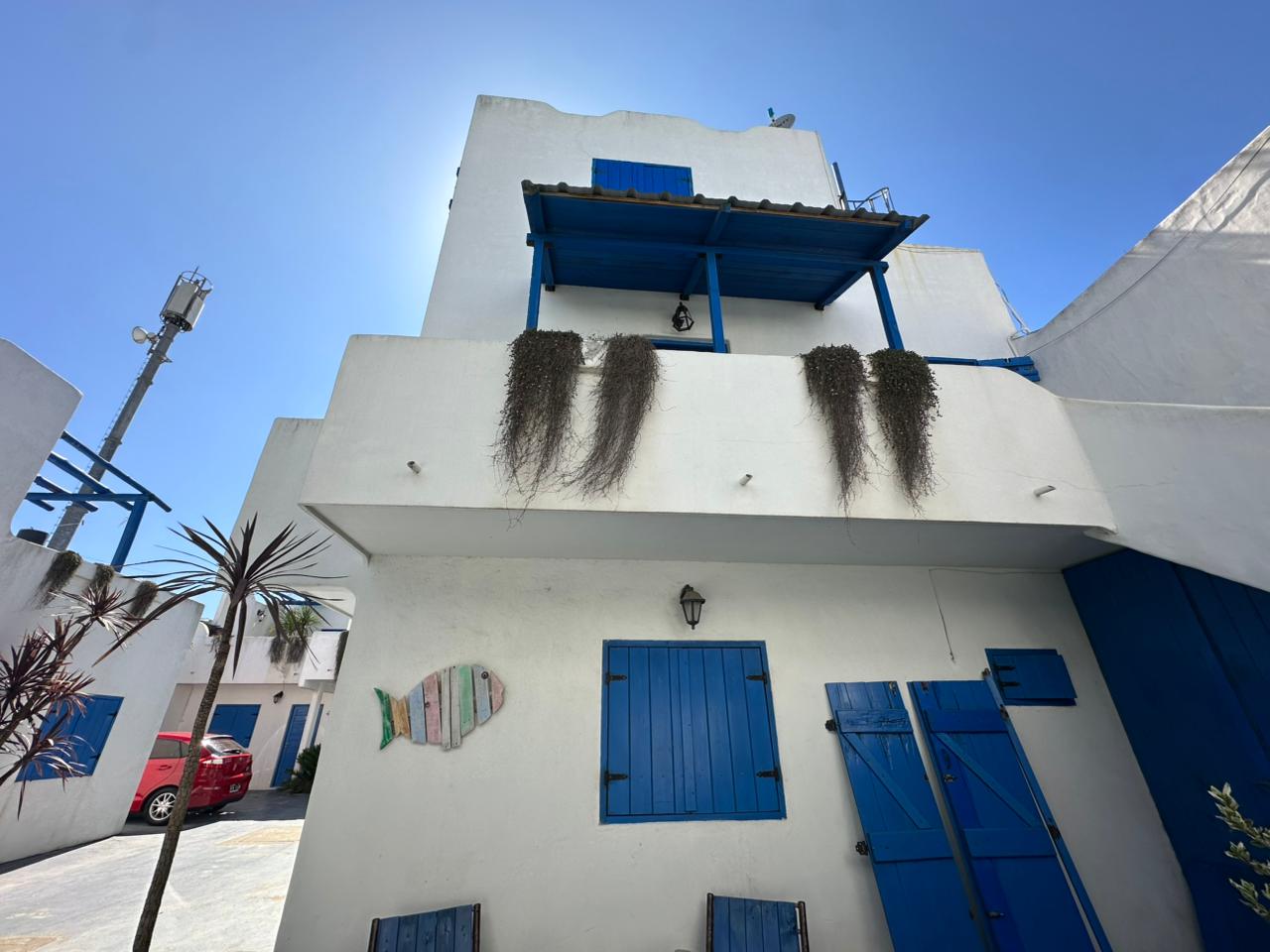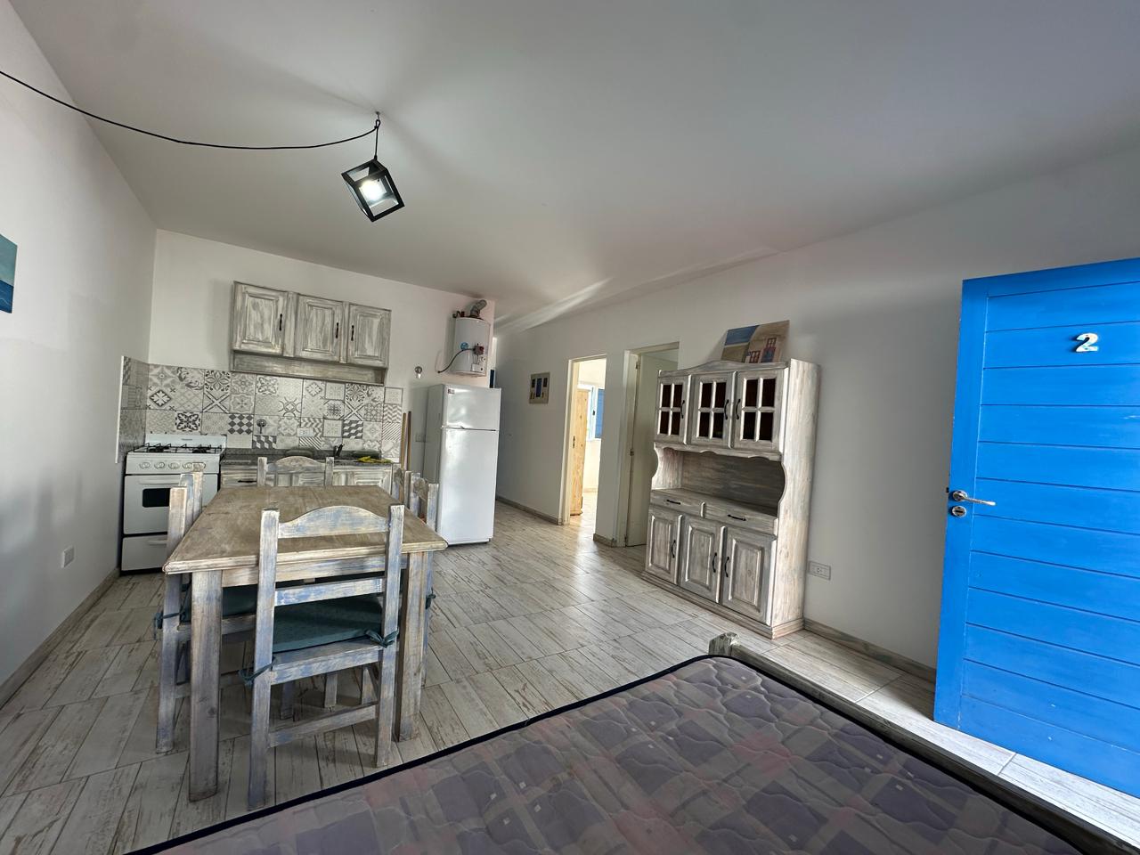 Departamento en PB; Complejo de arquitectura con inspiración en las costas mediterráneas del mar Egeo. 3 ambientes, cocina-comedor con mesada, bajo mesada, bacha de acero inoxidable. Cuenta con dos habitaciones,dormitorio matrimonial con cama de 2 plazas. Seguido de baño completo con ducha, bidet e inodoro, recubierto con azulejos en un estilo pixel art moderno. Siguiente habitación con 2 camas cuchetas y ventana con vista al complejo. Patio con verde Cerrado por los costados con paredones de 2.5M y parrilla.
