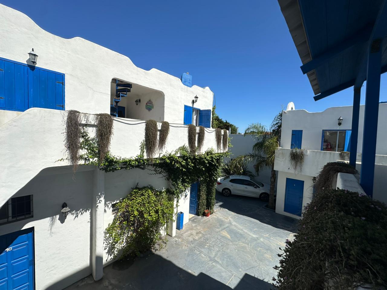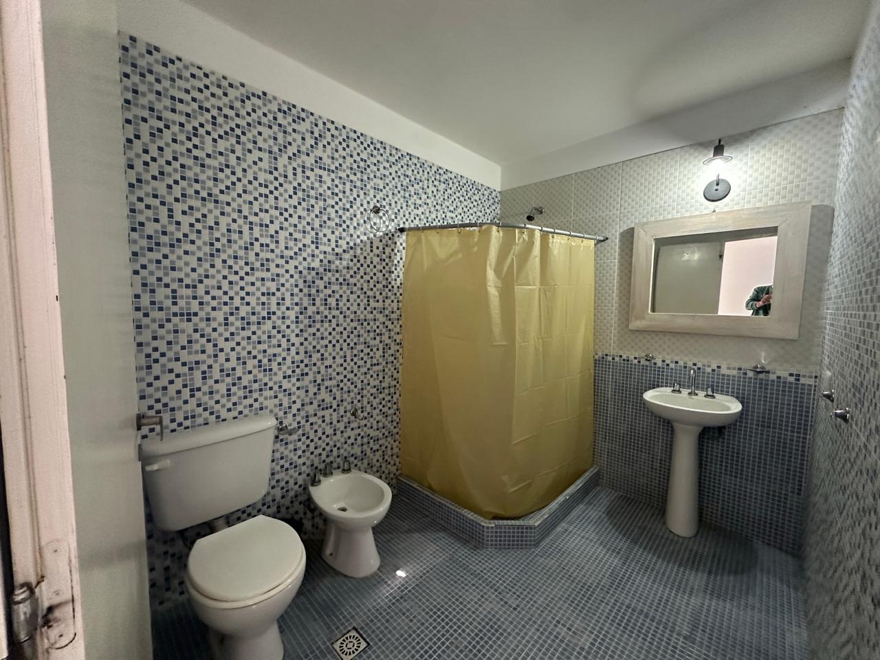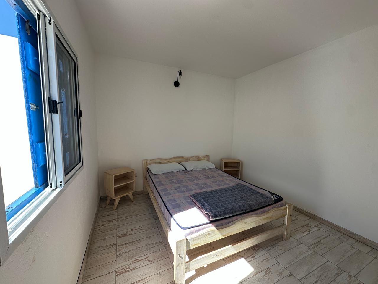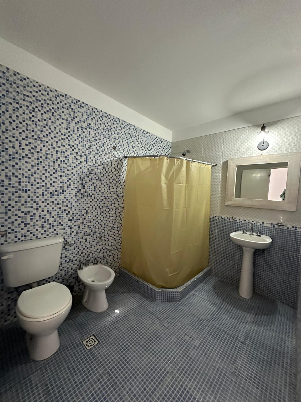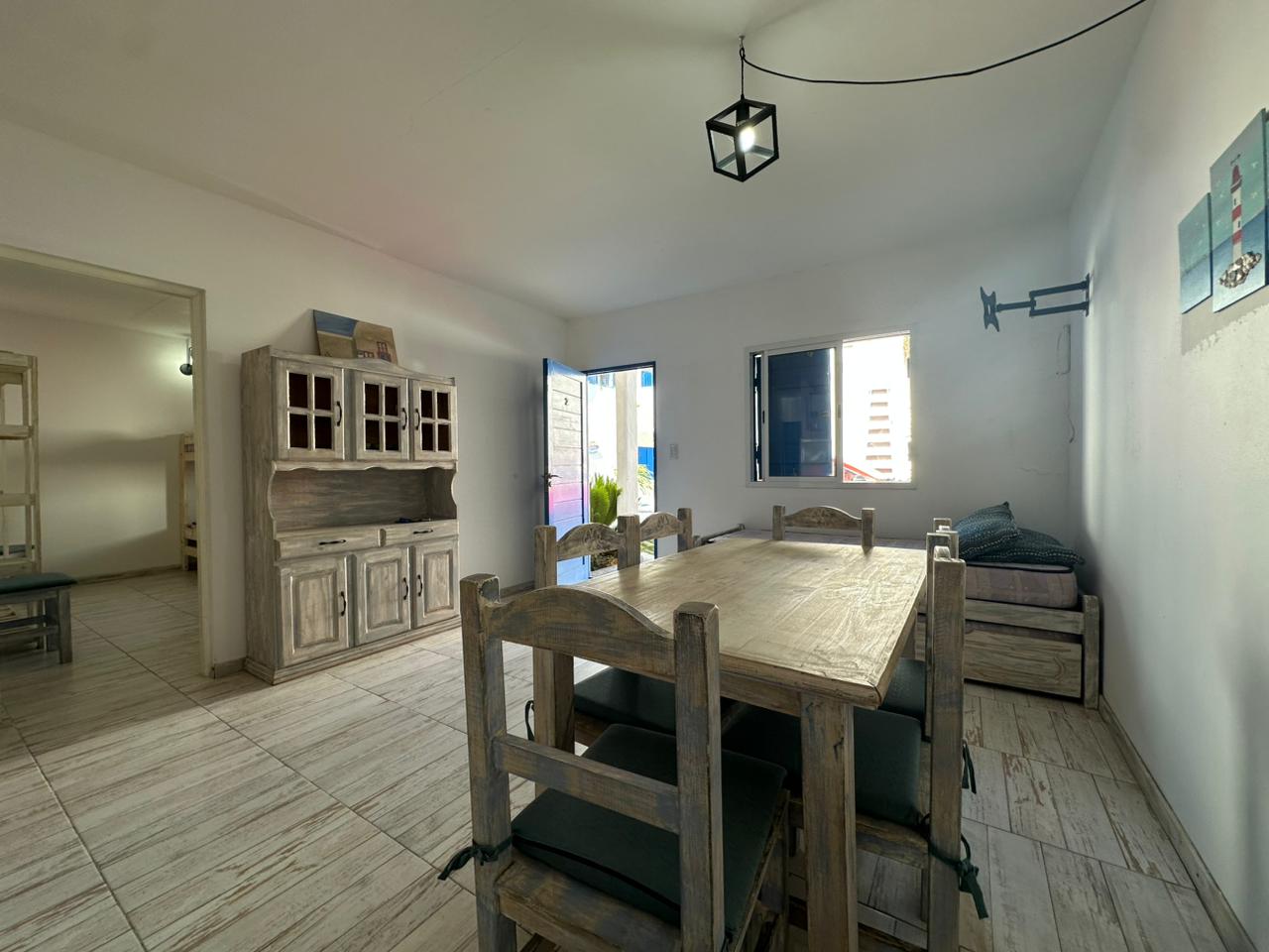 Departamento en PB; Complejo de arquitectura con inspiración en las costas mediterráneas del mar Egeo. 3 ambientes, cocina-comedor con mesada, bajo mesada, bacha de acero inoxidable. Cuenta con dos habitaciones,dormitorio matrimonial con cama de 2 plazas. Seguido de baño completo con ducha, bidet e inodoro, recubierto con azulejos en un estilo pixel art moderno. Siguiente habitación con 2 camas cuchetas y ventana con vista al complejo. Patio con verde Cerrado por los costados con paredones de 2.5M y parrilla.