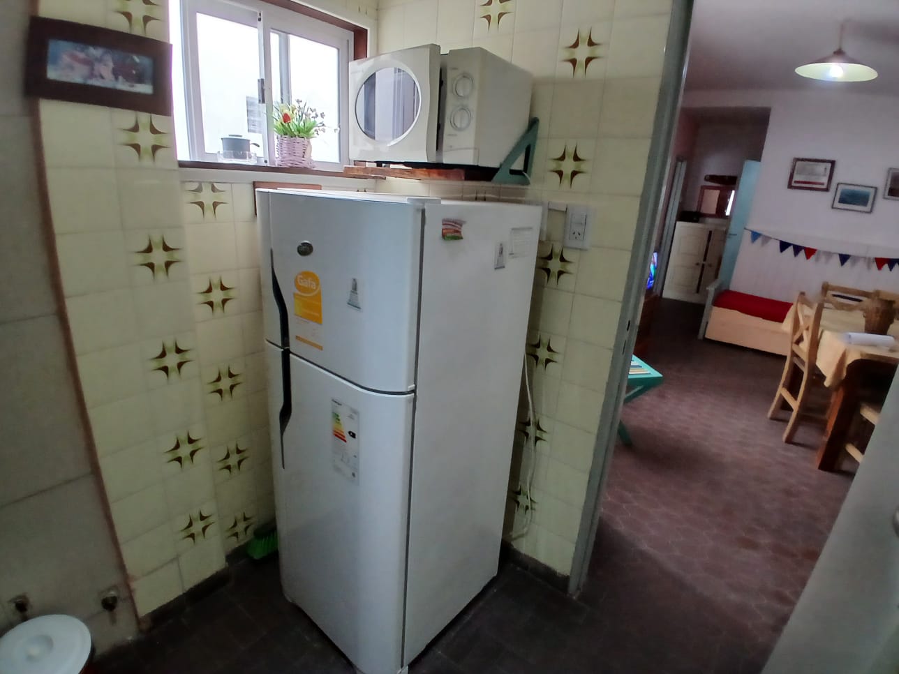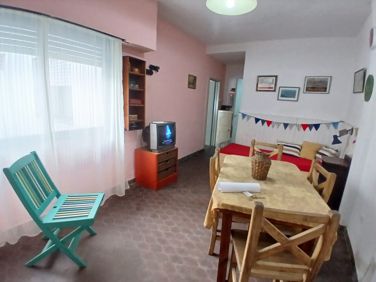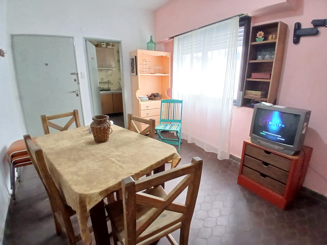 Departamento de 2 ambientes para 4 personas, con un dormitorio cerrado con 2 camas de 1p, NO TIENE MATRIMONIAL, cama de una plaza con carrito en living comedor. directv recargable. Cocina separada, heladera con freezer, microondas. Garrafa (a cargo del inq). Acepta mascota.