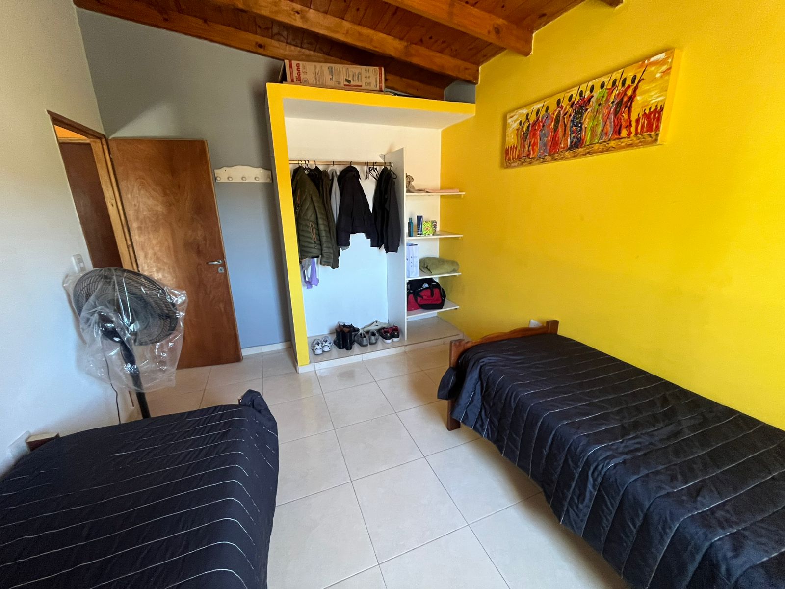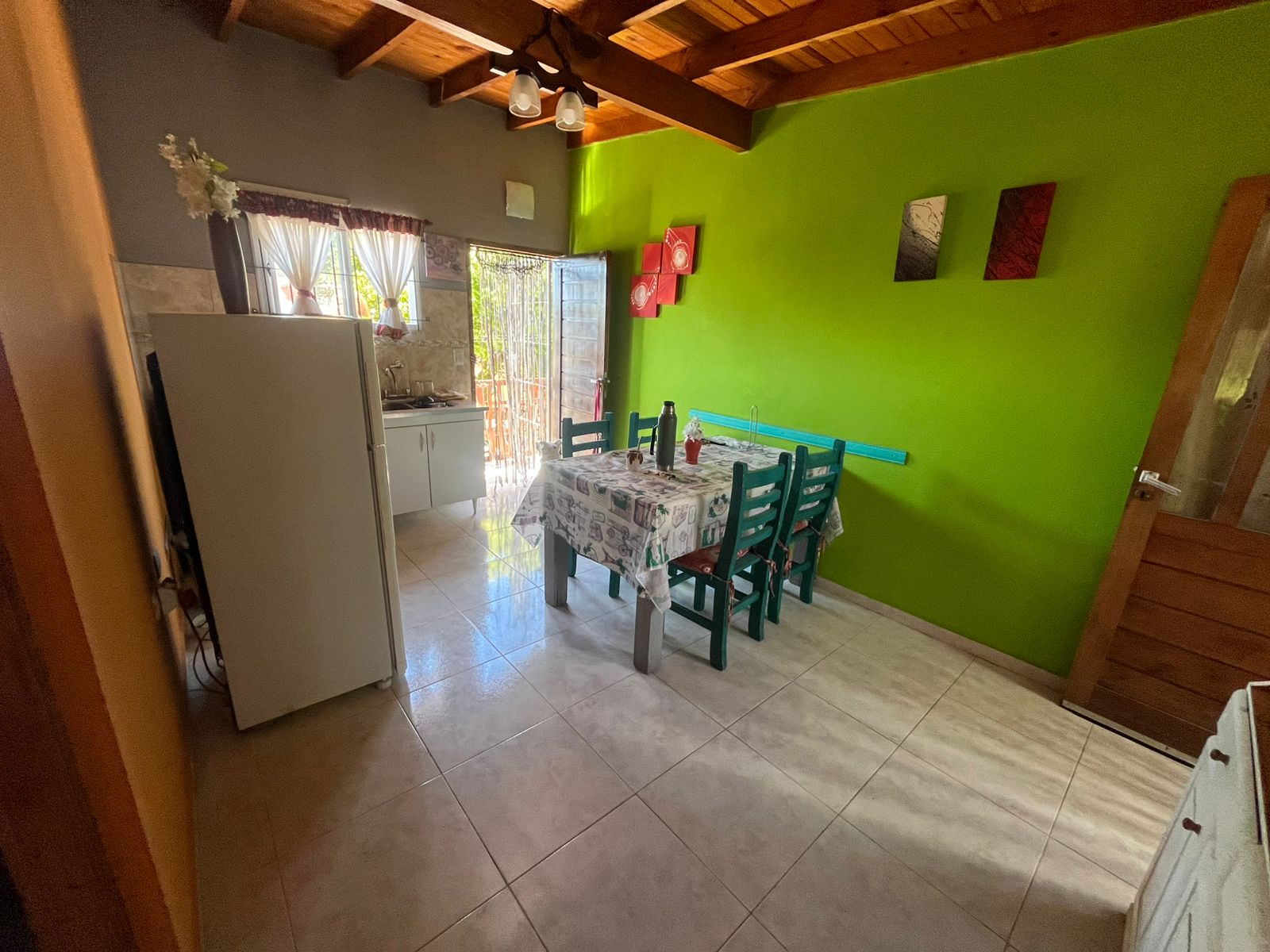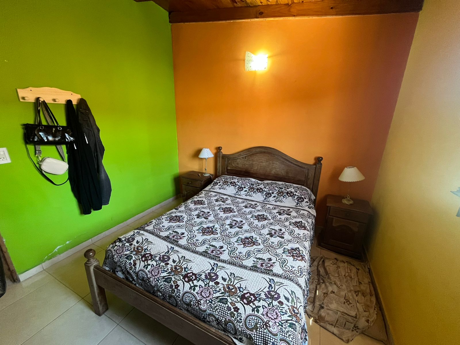 Ingresando por camino vehicular, nos dirigimos al segundo bloque constructivo en el que unas escaleras de mampostería nos llevan al primer piso en donde se encuentra un pequeño balcón con barandas de madera de pino de media altura. Hacia el lado derecho se encuentra el ingreso a la propiedad, tras unas rejas de color gris seguidas de una puerta de madera, que nos darían ingreso al principal ambiente compuesto por una cocina comedor formada con un piso de cerámica, unas paredes de color verde manzana y un techo de madera y por encima chapa acanalada. Al frente podemos encontrar 2 puertas, una en dirección al baño completo que cuenta con ducha, lavamanos, espejo, inodoro y bidet. Este mismo revestido a una altura de 2.30 metros por cerámicos color gris, y otra que se dirige al patio trasero con brasero con campana y una pileta lavadero. Por otro lado, hacia el lado derecho del living comedor nos encontramos con las dos puertas que se dirigen a las habitaciones, las cuales cuentan cada una con una ventana de aluminio y rejas en la misma, tienen dirección al norte.