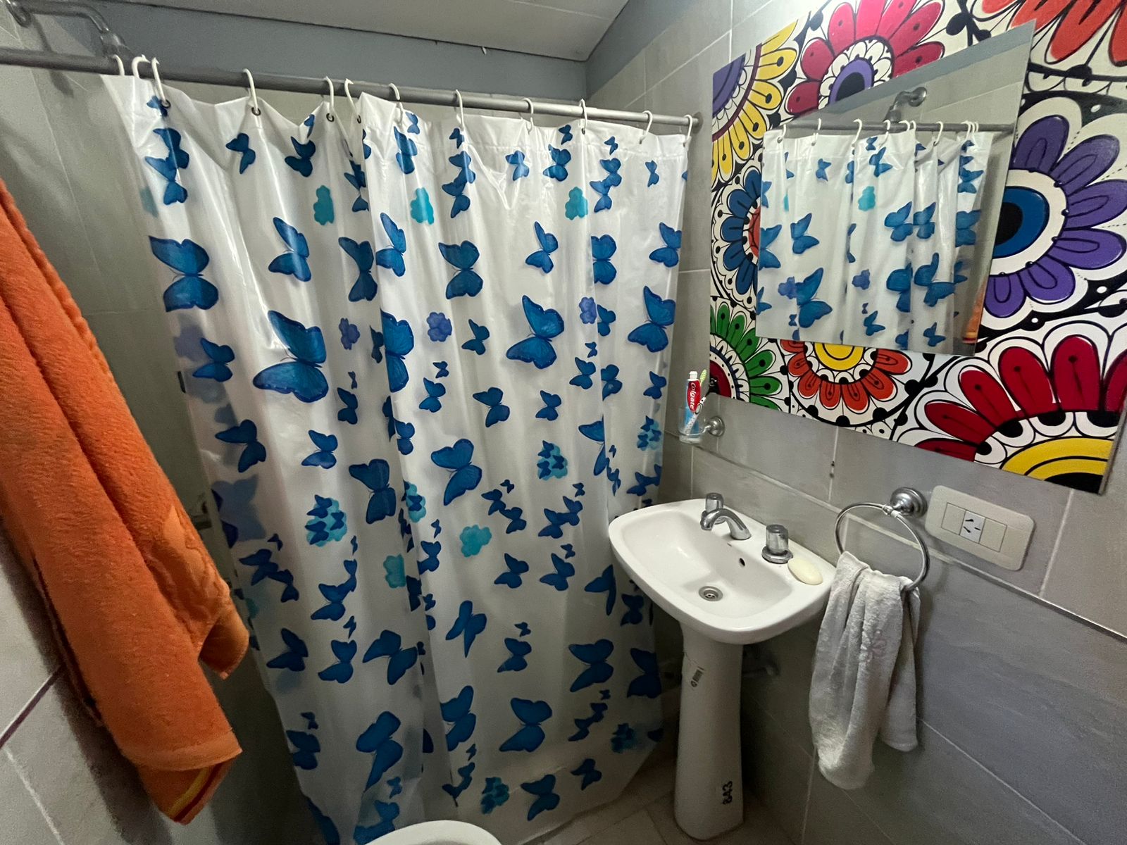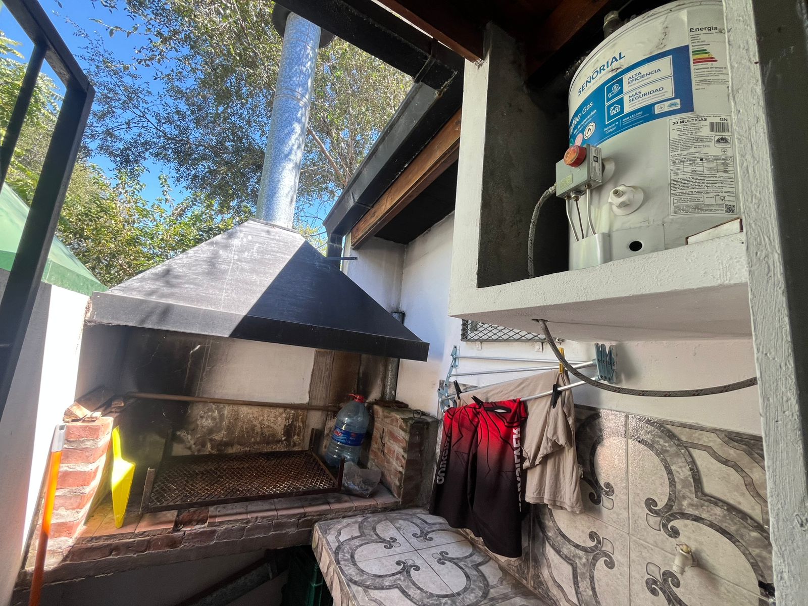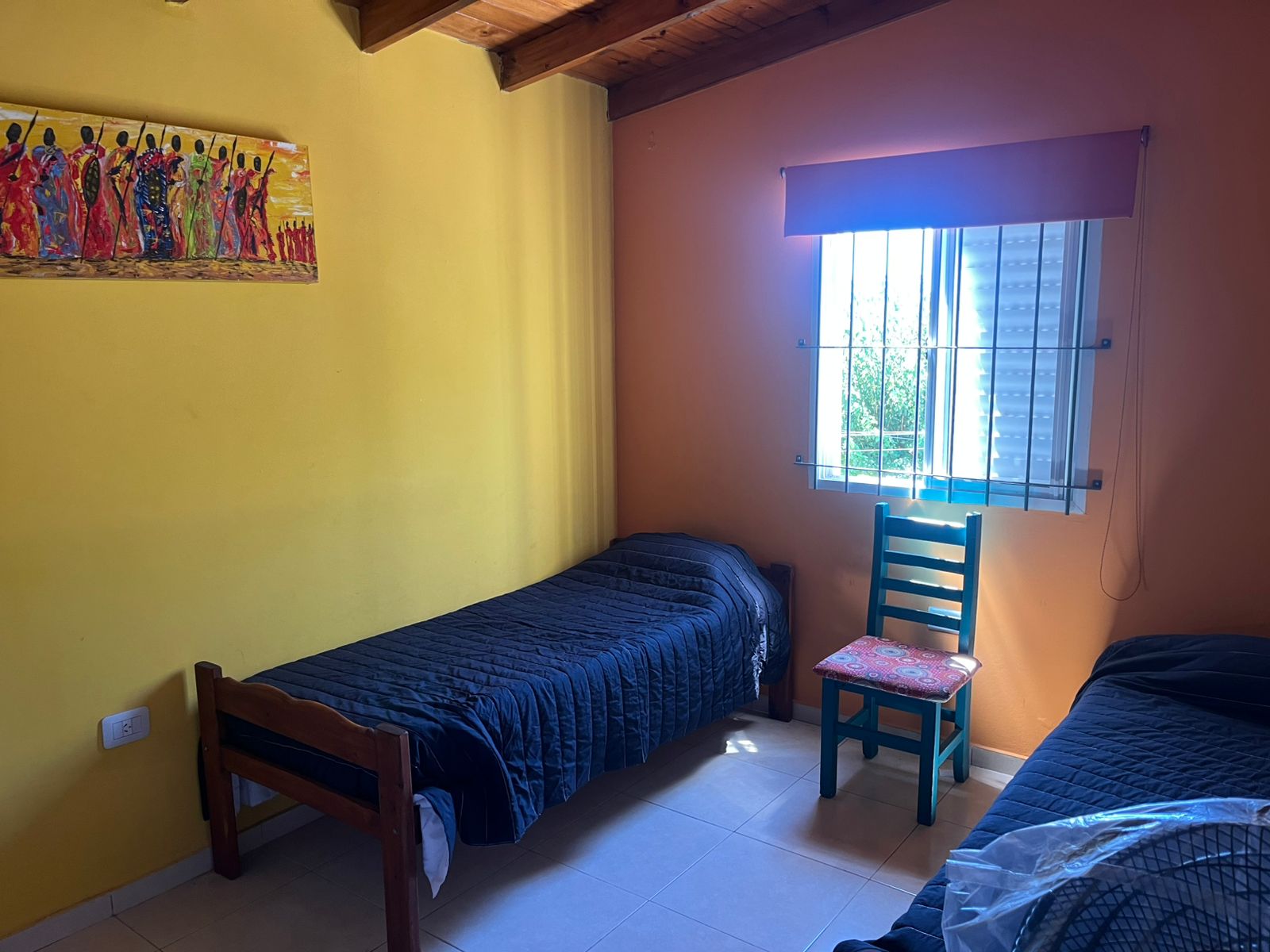 Ingresando por camino vehicular, nos dirigimos al segundo bloque constructivo en el que unas escaleras de mampostería nos llevan al primer piso en donde se encuentra un pequeño balcón con barandas de madera de pino de media altura. Hacia el lado derecho se encuentra el ingreso a la propiedad, tras unas rejas de color gris seguidas de una puerta de madera, que nos darían ingreso al principal ambiente compuesto por una cocina comedor formada con un piso de cerámica, unas paredes de color verde manzana y un techo de madera y por encima chapa acanalada. Al frente podemos encontrar 2 puertas, una en dirección al baño completo que cuenta con ducha, lavamanos, espejo, inodoro y bidet. Este mismo revestido a una altura de 2.30 metros por cerámicos color gris, y otra que se dirige al patio trasero con brasero con campana y una pileta lavadero. Por otro lado, hacia el lado derecho del living comedor nos encontramos con las dos puertas que se dirigen a las habitaciones, las cuales cuentan cada una con una ventana de aluminio y rejas en la misma, tienen dirección al norte.