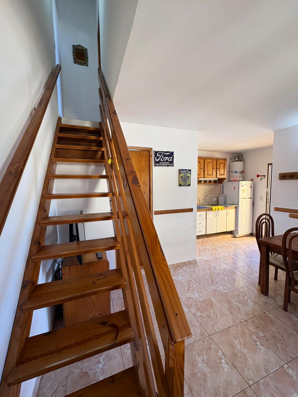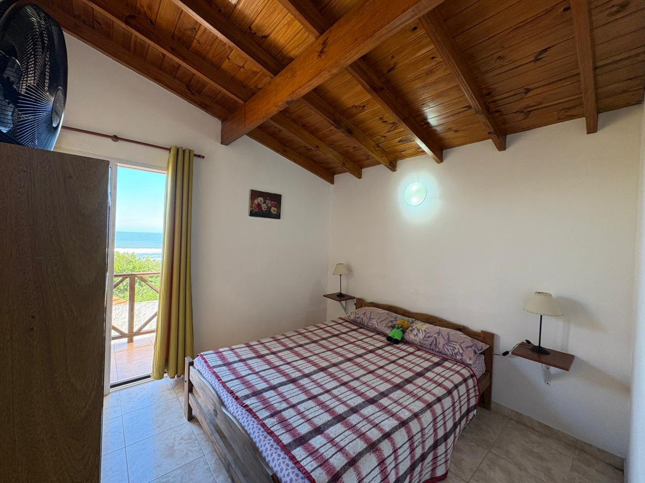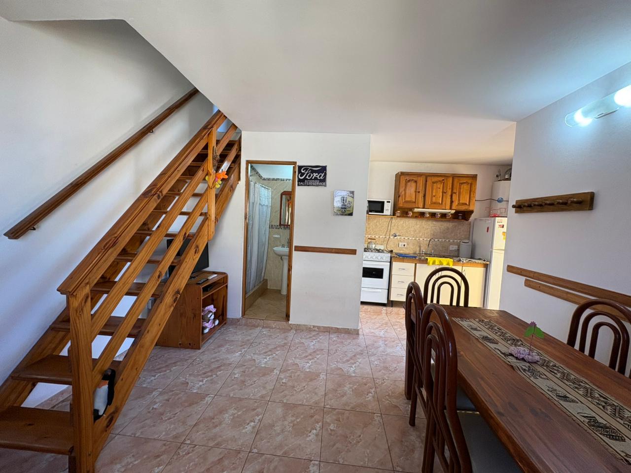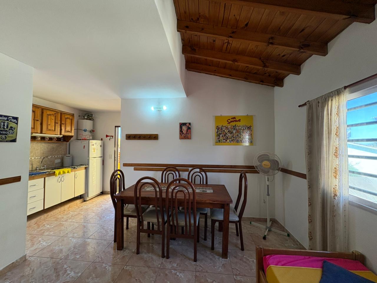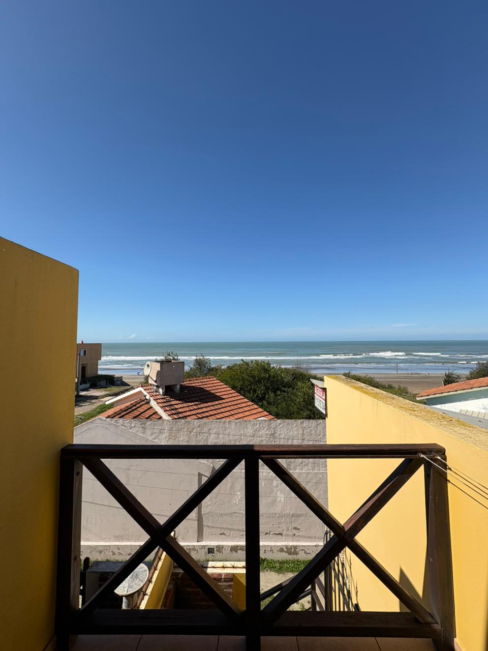 Ingresamos al complejo por medio de un portón de madera de aproximadamente 1,80 m de altura, que da acceso al camino vehicular común.Nos dirigimos al segundo bloque constructivo y accedemos al primer piso por escalera de mampostería. Al llegar, del lado izquierdo, encontramos el sector de parrilla, una bacha de cemento y, por debajo, un gabinete destinado a la conexión de garrafa.El ingreso a la propiedad se realiza a través de una reja de barrotes color negro y, a continuación, una puerta de madera en tono roble oscuro. Al ingresar, hacia la izquierda, se ubica la primera habitación con orientación sureste, cuyas medidas aproximadas son de 2,50 x 2,50 m.Continuando, se desarrolla la cocina integrada, equipada con mesada, bajo mesada, bacha de acero inoxidable, alacena, heladera y cocina artefacto. Seguido de este espacio, se encuentra el living-comedor, que se destaca por su muy buena iluminación natural.A continuación, se dispone el baño completo, revestido en cerámicos hasta una altura aproximada de 2 metros.Desde el living-comedor accedemos, mediante una escalera de madera de pino en tono roble oscuro, al segundo piso, donde se encuentra la habitación principal, con medidas aproximadas de 3,00 x 2,80 m. Este ambiente cuenta con salida a un balcón con vista al mar, ideal para disfrutar de la luz natural y el entorno.