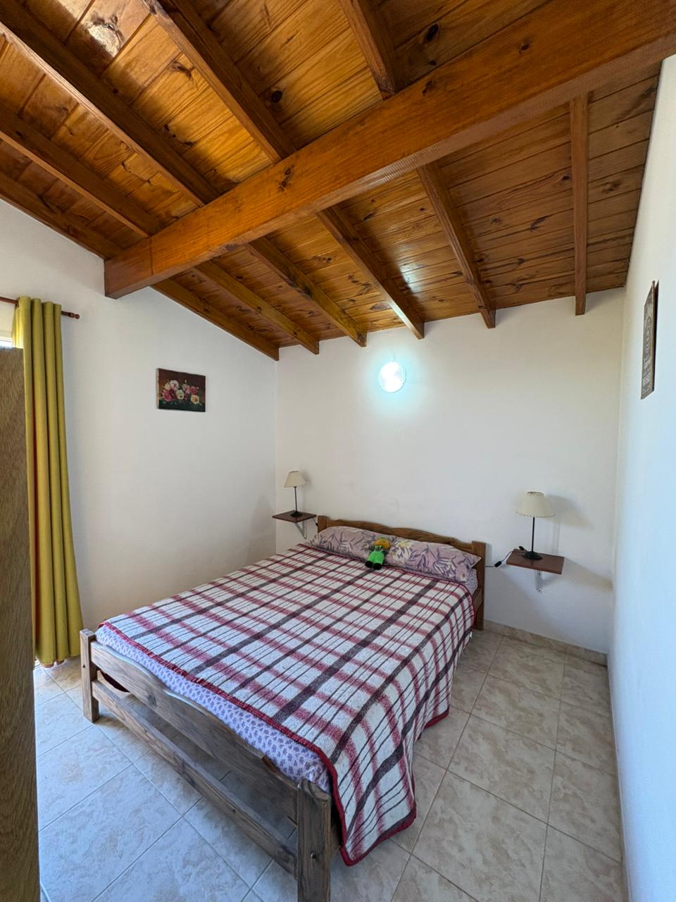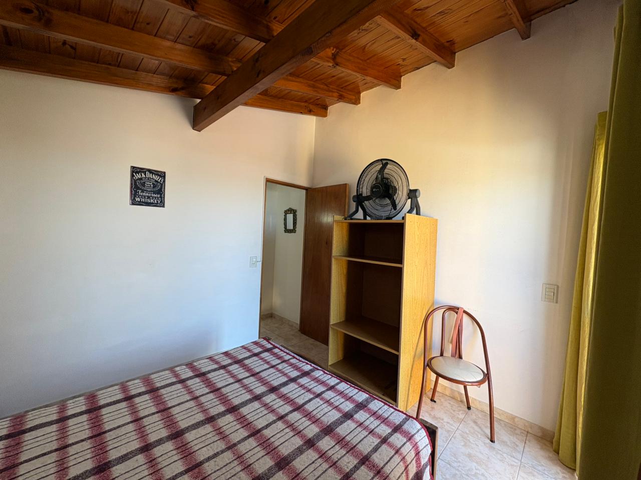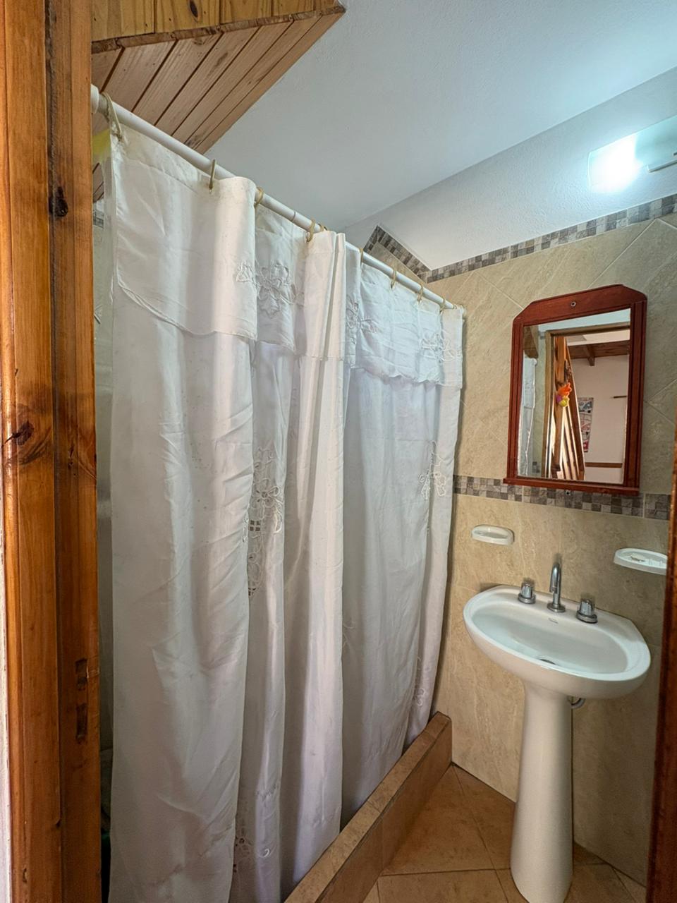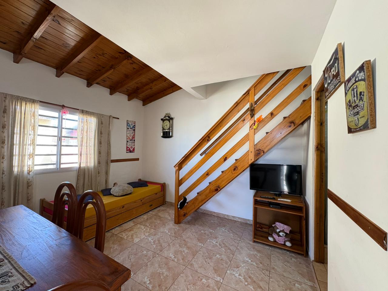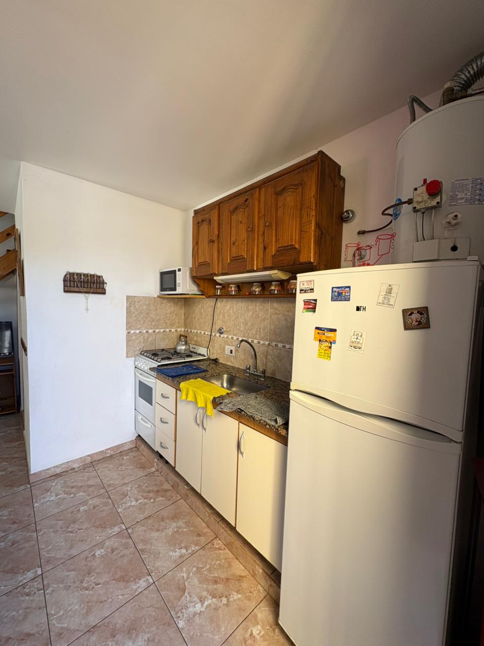 Ingresamos al complejo por medio de un portón de madera de aproximadamente 1,80 m de altura, que da acceso al camino vehicular común.Nos dirigimos al segundo bloque constructivo y accedemos al primer piso por escalera de mampostería. Al llegar, del lado izquierdo, encontramos el sector de parrilla, una bacha de cemento y, por debajo, un gabinete destinado a la conexión de garrafa.El ingreso a la propiedad se realiza a través de una reja de barrotes color negro y, a continuación, una puerta de madera en tono roble oscuro. Al ingresar, hacia la izquierda, se ubica la primera habitación con orientación sureste, cuyas medidas aproximadas son de 2,50 x 2,50 m.Continuando, se desarrolla la cocina integrada, equipada con mesada, bajo mesada, bacha de acero inoxidable, alacena, heladera y cocina artefacto. Seguido de este espacio, se encuentra el living-comedor, que se destaca por su muy buena iluminación natural.A continuación, se dispone el baño completo, revestido en cerámicos hasta una altura aproximada de 2 metros.Desde el living-comedor accedemos, mediante una escalera de madera de pino en tono roble oscuro, al segundo piso, donde se encuentra la habitación principal, con medidas aproximadas de 3,00 x 2,80 m. Este ambiente cuenta con salida a un balcón con vista al mar, ideal para disfrutar de la luz natural y el entorno.
