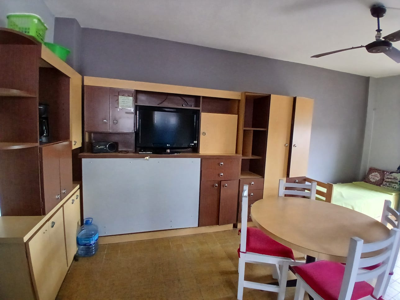 Monoambiente ubicado en tercer piso por escalera. La unidad se desarrolla en un ambiente único, amplio y bien distribuido, con excelente ingreso de luz y ventilación natural. Al ingresar nos encontramos con un espacio living comedor espacioso equipado con muebles de madera de buen guardar, pisos cerámicos, ventilación de techo, paredes en buen estado de conservación y una distribución funcional que permite diferenciar cómodamente el sector de estar, comedor y descanso. El sector de descanso está amoblado y bien distribuido con cama matrimonial e individual. Dos ventanales con persianas de aluminio con salida a terraza, El sector de cocina se encuentra integrado, con mesada, bacha de acero inoxidable, mobiliario bajo mesada, cocina a gas y revestimientos cerámicos en paredes y pisos. El baño completo en buen estado y con revestimientos cerámicos.