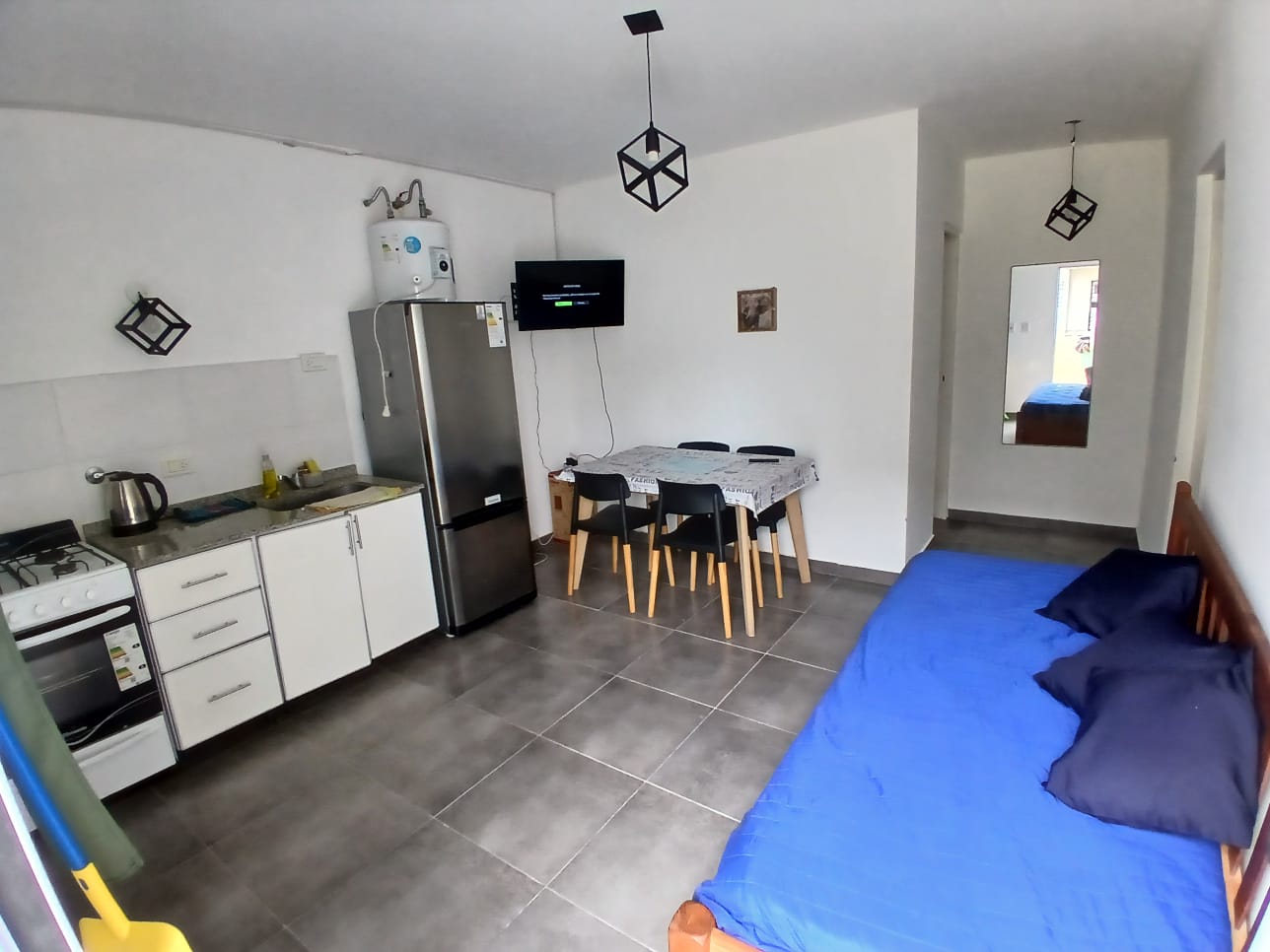 Departamento en pb de 2 ambientes. Consta de cocina-comedor con una cama de 1 plaza + carrito, baño completo y 1 habitación con cama matrimonial. Cuenta con espacio vehicular descubierto y parrilla. Heladera con Freezer, 1 ventilador, 1 Android TV, WI-Fi incluido y gas envasado (a cargo inq). No acepta mascotas.