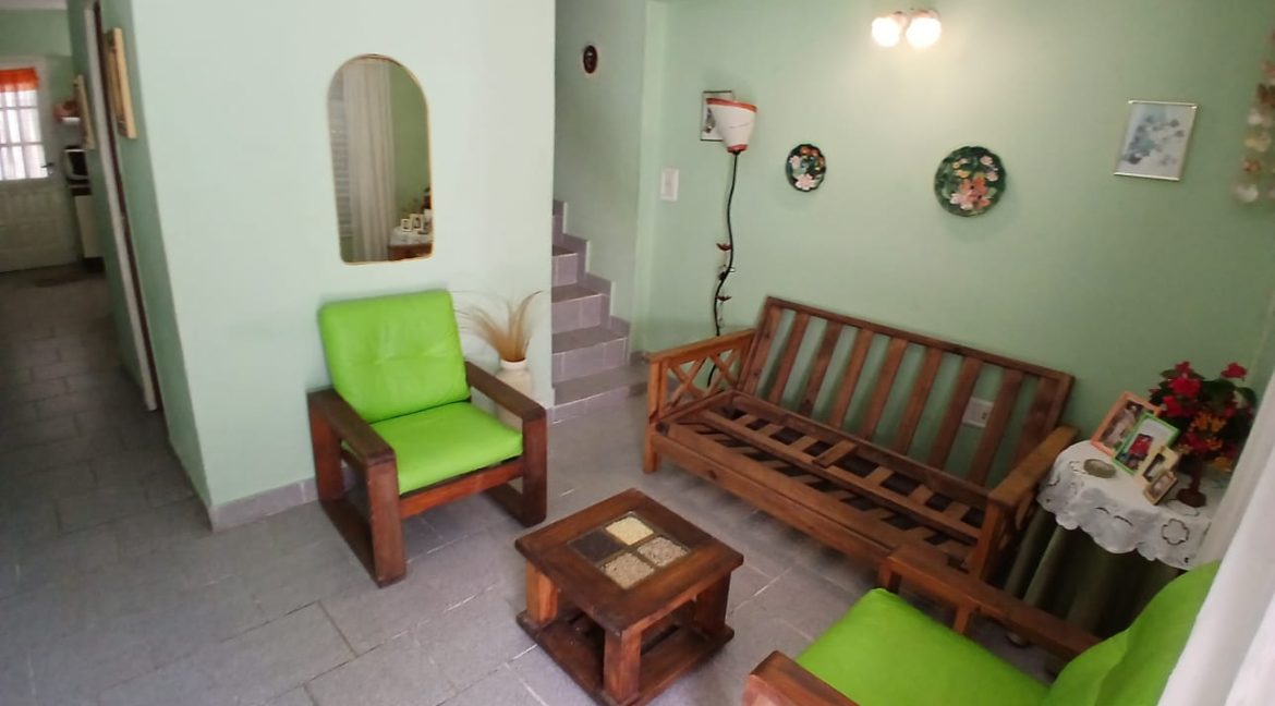 Accedemos por el espacio vehicular y luego a la propiedad a través de una puerta reja blanca y una puerta de madera con vidrios repartidos. Al ingresar, nos recibe un pequeño living, acogedor y luminoso, con una ventana al frente que aporta excelente luz natural.