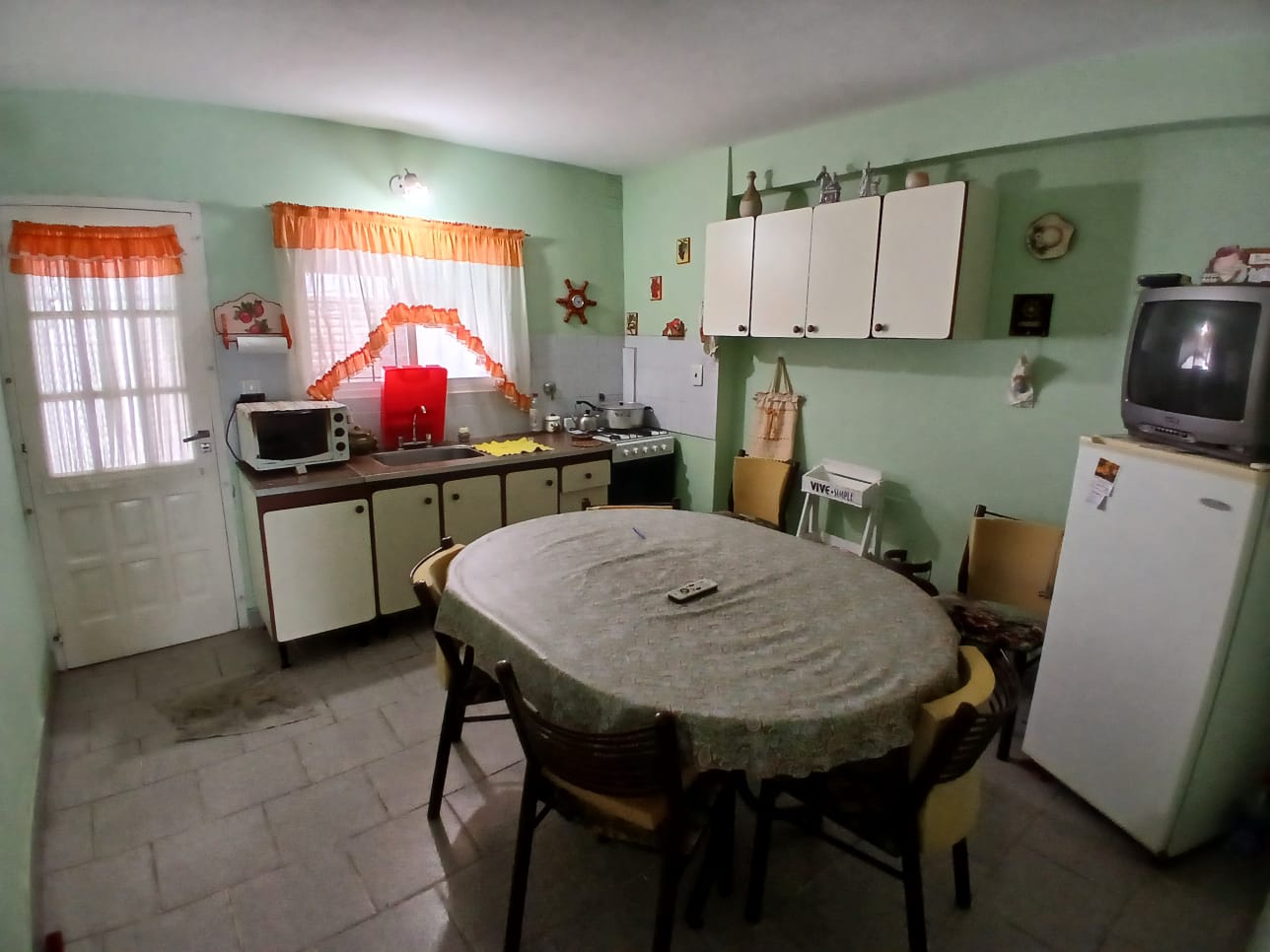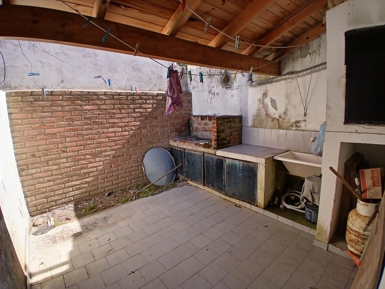 Siguiendo el recorrido, llegamos a la cocina-comedor, que cuenta con mesada, bajo mesada, bacha de acero inoxidable y alacena. Debajo de la ventana presenta un revestimiento de cerámicas en tono gris claro, aportando un detalle moderno y funcional. A la izquierda, una puerta de madera con vidrios repartidos nos da acceso al patio exterior, el cual dispone de bombeador, conexión para garrafa, termotanque a gas y un práctico brasero ideal para disfrutar de parrilladas al aire libre.