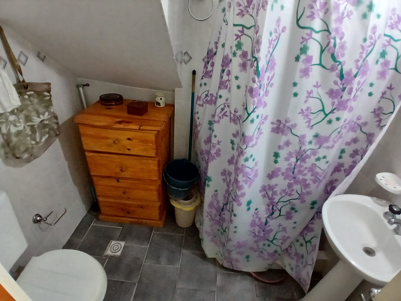 A continuación del living se encuentra el baño de planta baja, equipado con inodoro y ducha completa, revestido hasta el techo con cerámicas en tonos grises, brindando practicidad y fácil mantenimiento.