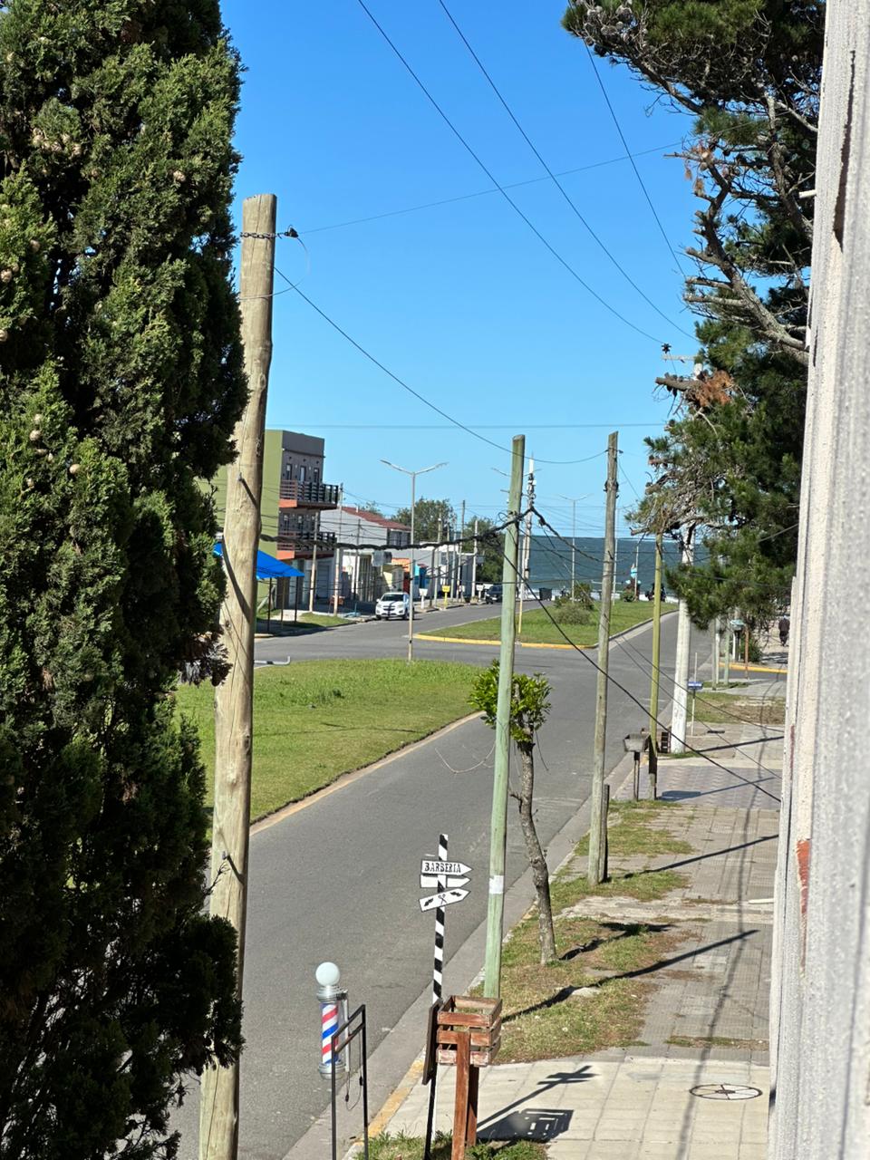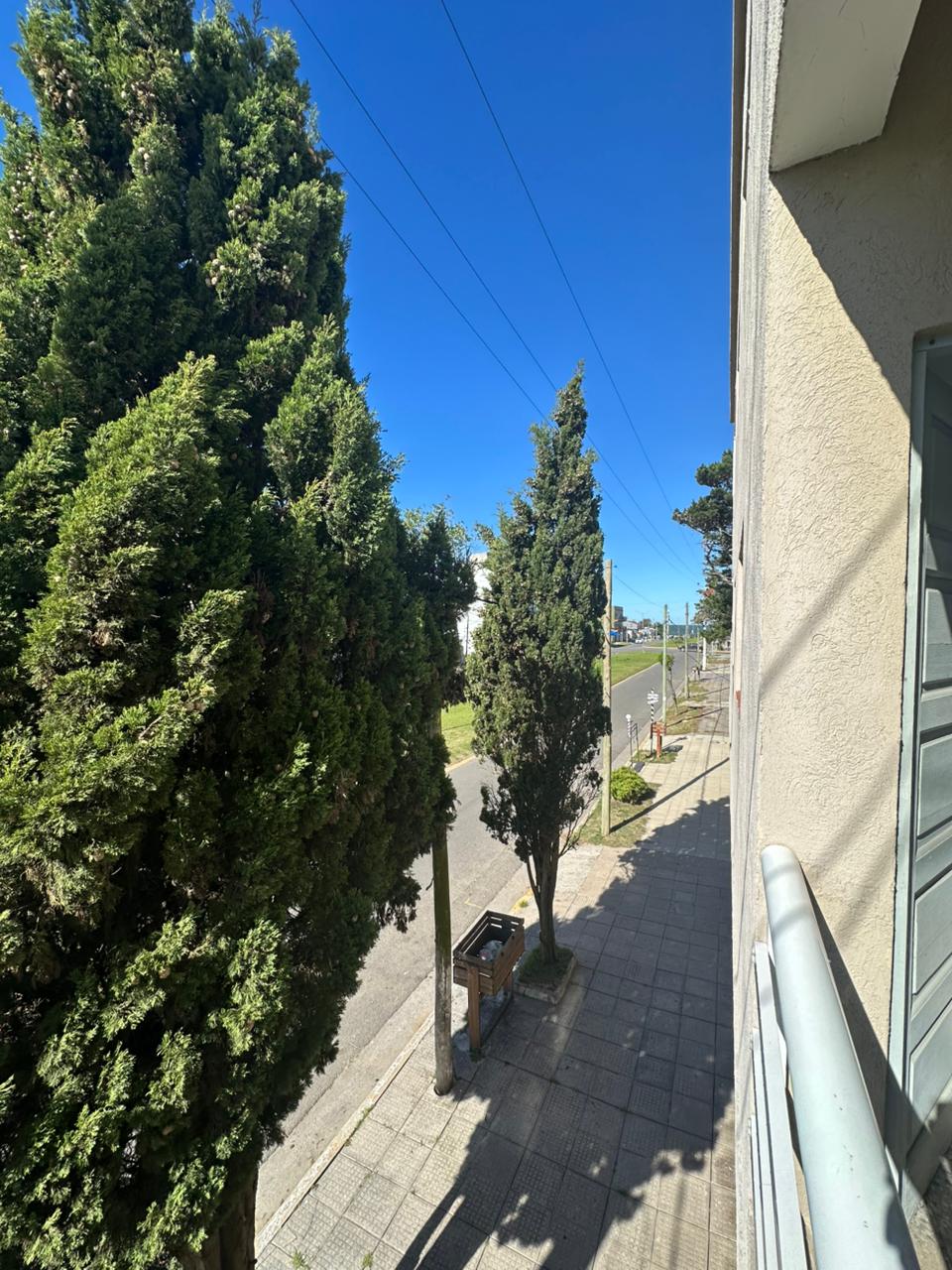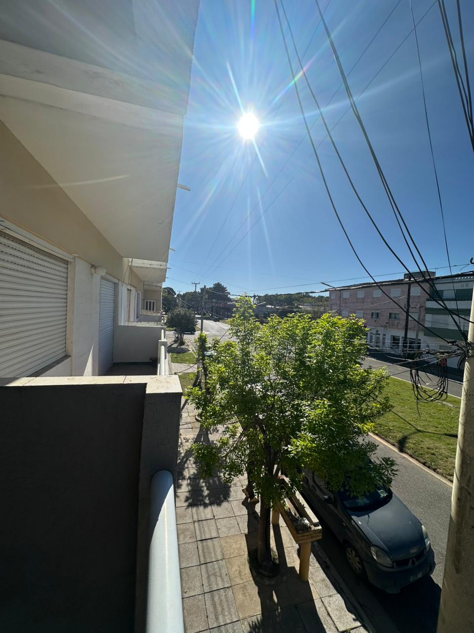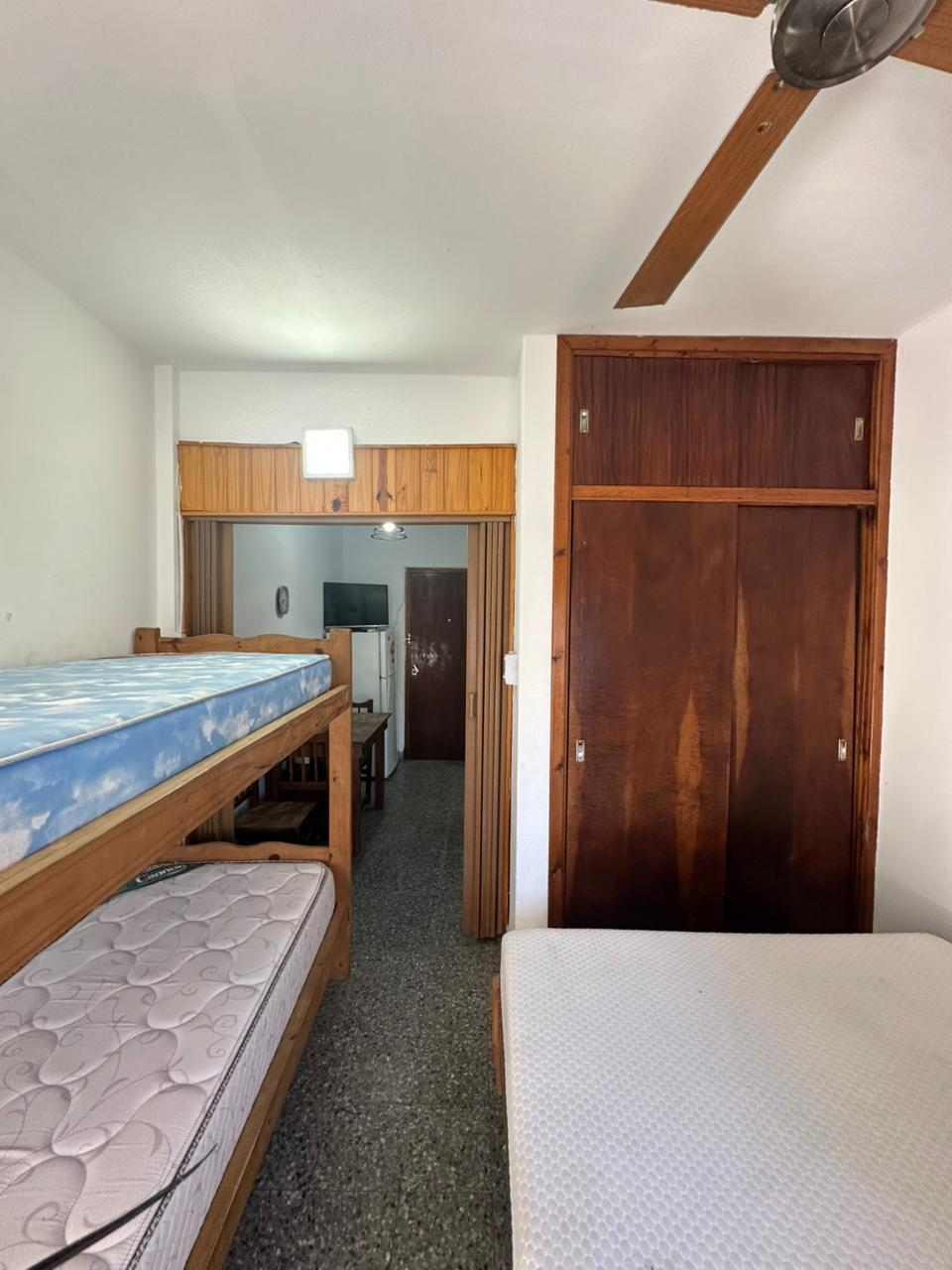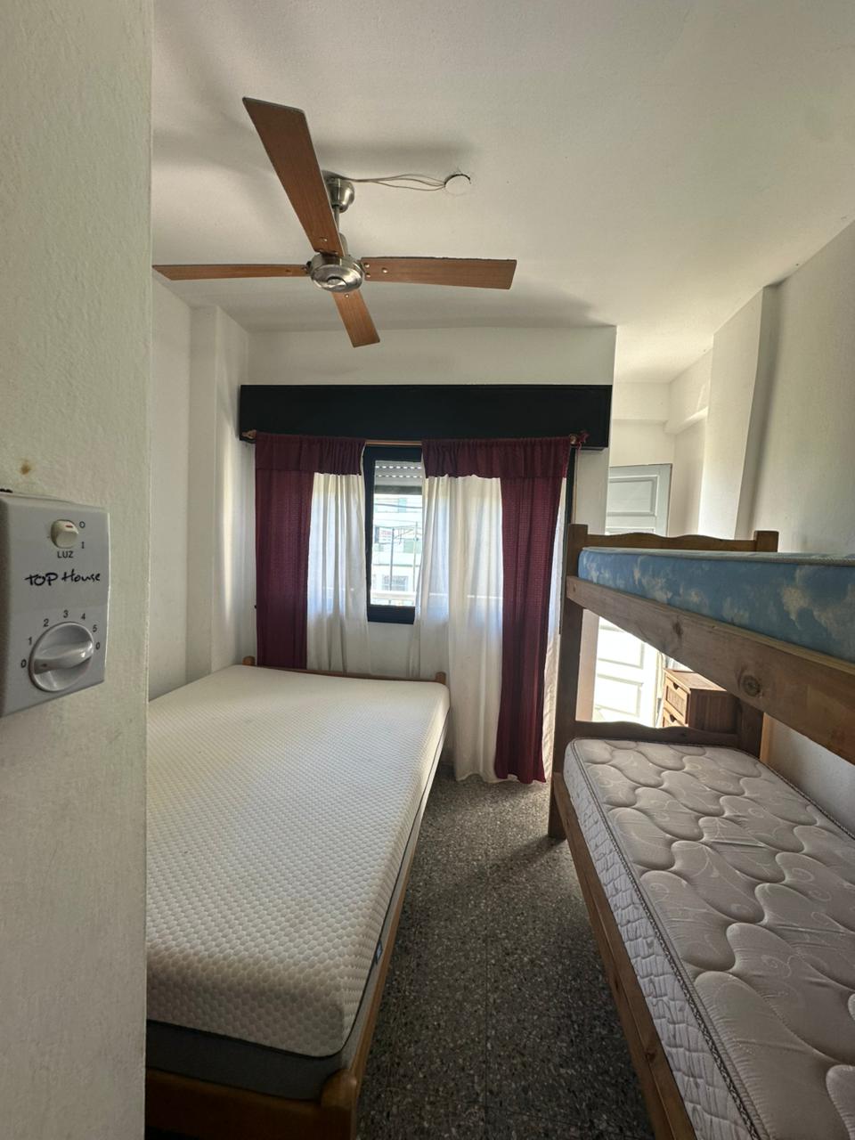Al fondo se encuentra la habitación principal, equipada con una cama matrimonial y una cama cucheta, ventilador de techo y ventana con cortinas que combinan tonos bordó y blanco, lo que le da un aire cálido al ambiente. Desde esta habitación se accede a un balcón que da al frente, con baranda metálica y vista a una calle arbolada, ideal para disfrutar del aire libre.