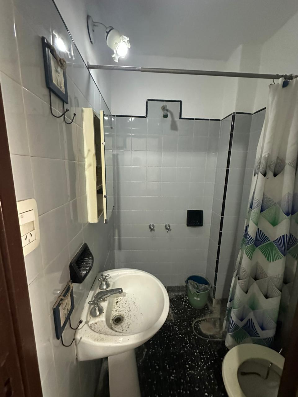 Siguiendo por el pasillo se accede al baño, totalmente revestido en cerámicos claros, con artefactos sanitarios en color blanco, ducha con cortina, espejo y lavamanos pedestal.