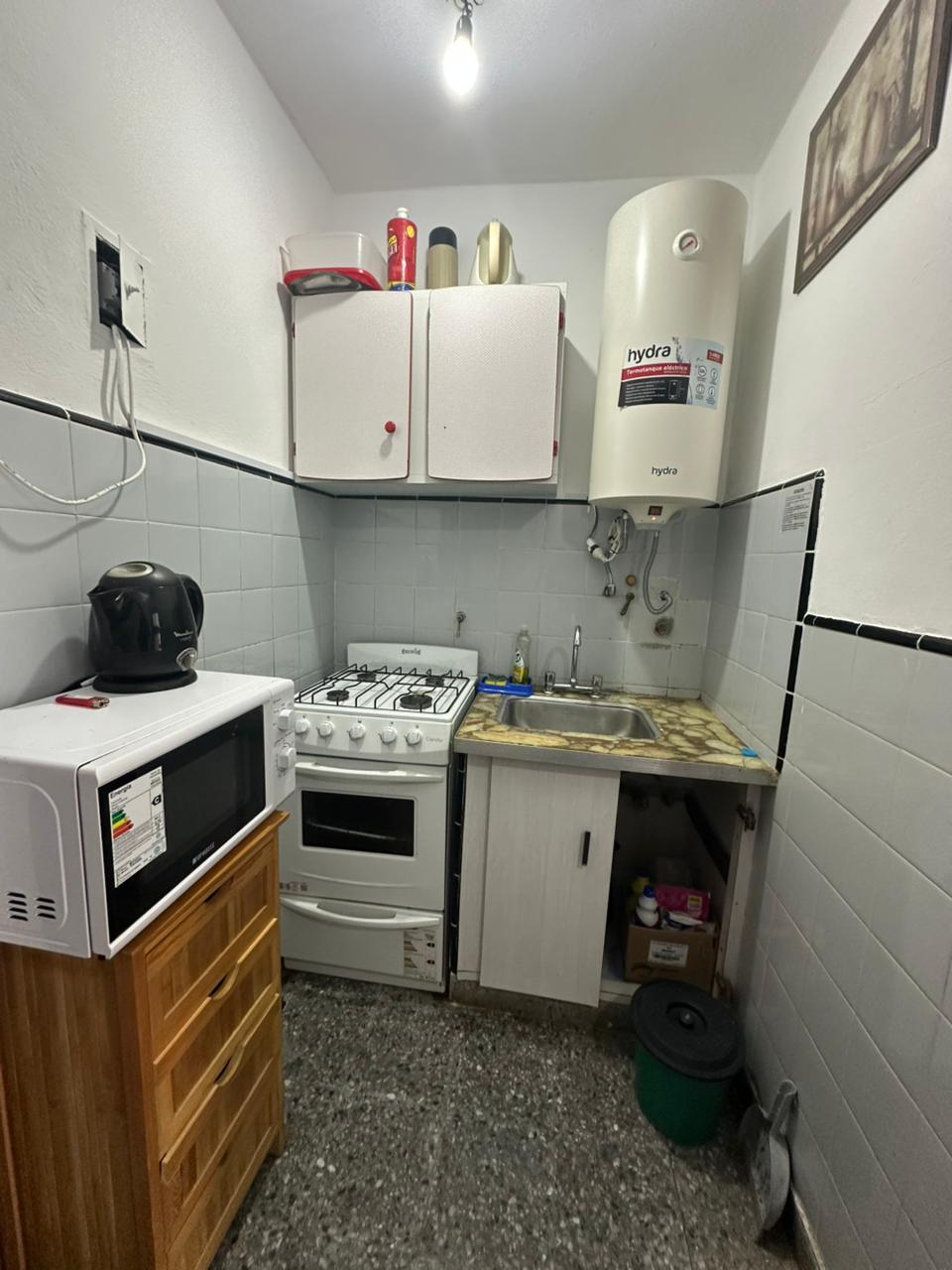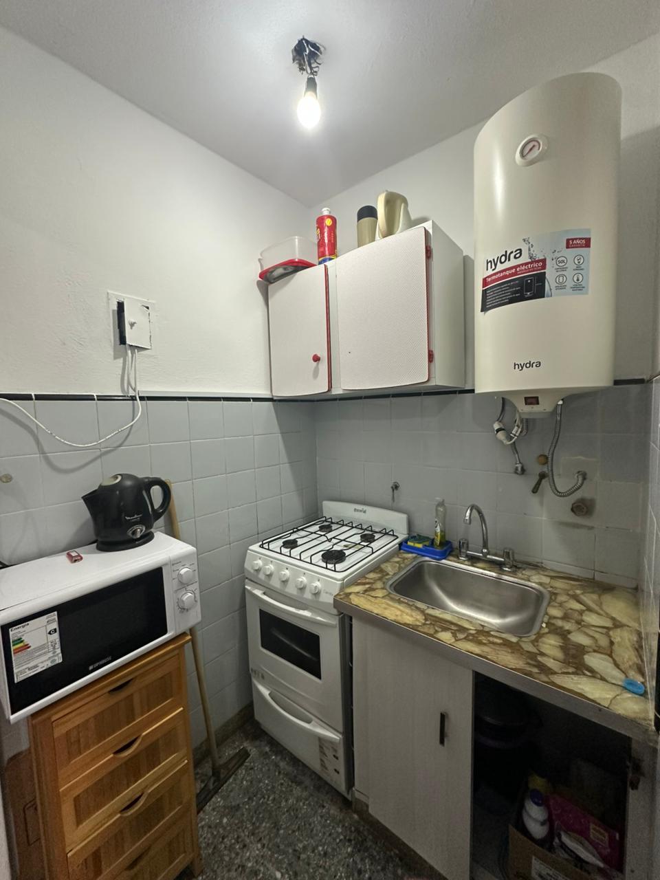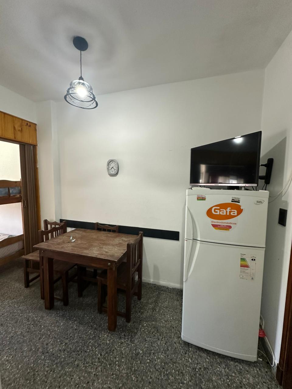 Al ingresar a la propiedad, se encuentra un ambiente principal luminoso donde se ubica el comedor, con una mesa de madera y cuatro sillas. A la izquierda se encuentra la cocina, de estilo compacto, revestida en cerámicos gris claro con guarda negra. Dispone de cocina a gas, termotanque eléctrico, pileta de acero inoxidable, mueble bajo mesada blanco y alacena superior con detalles rojos, y espacio de guardado adicional.