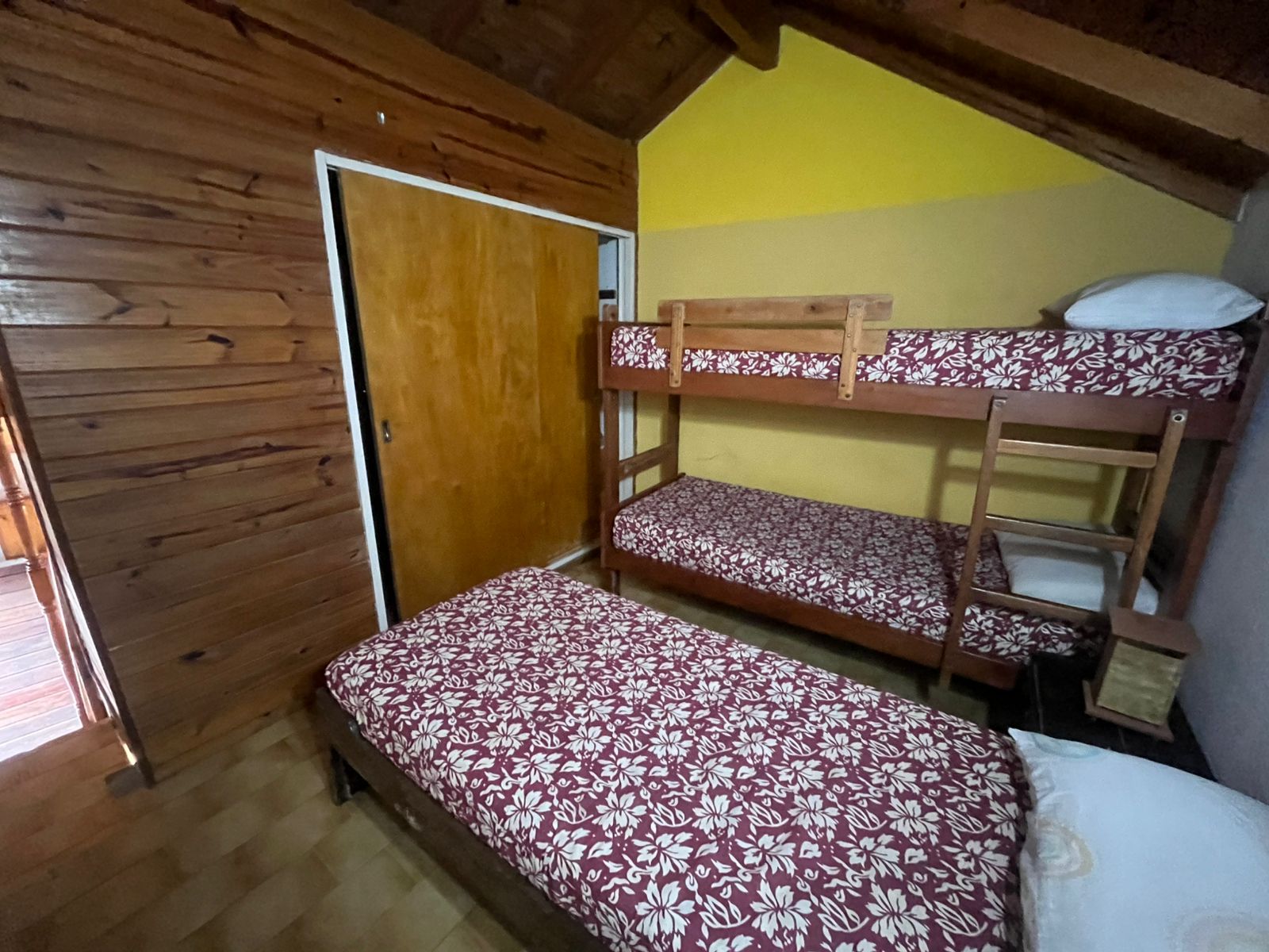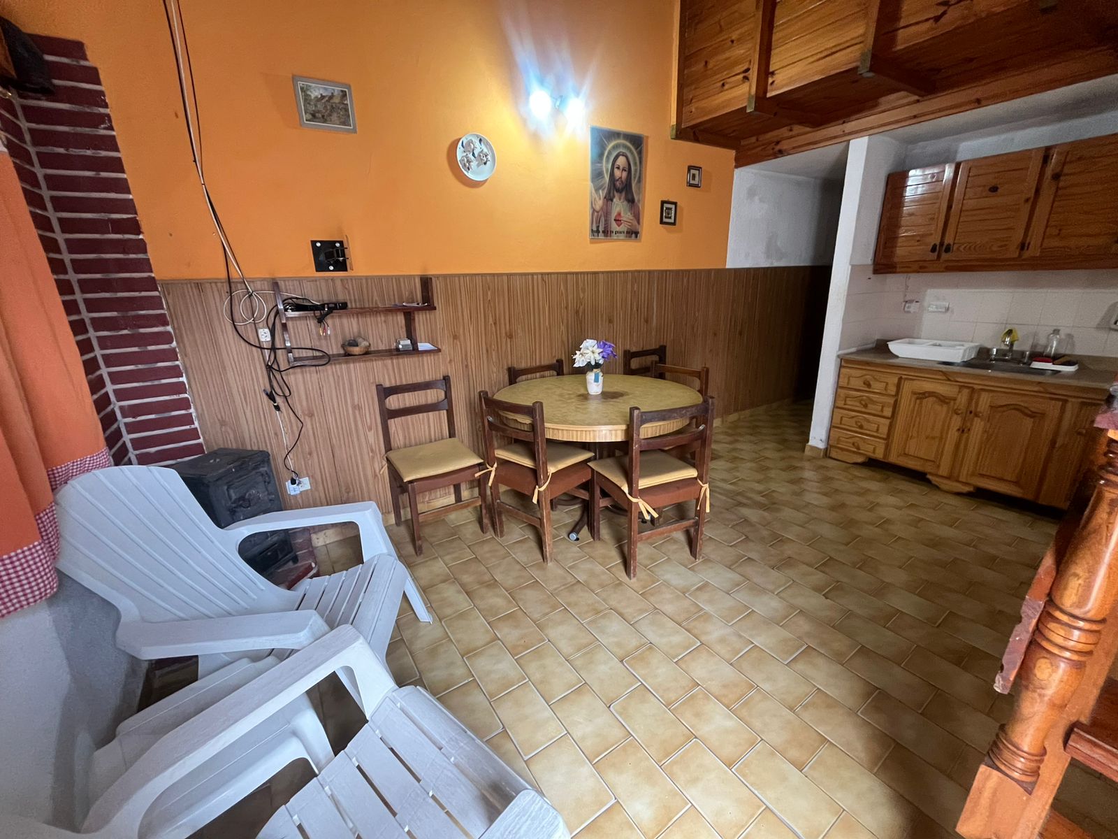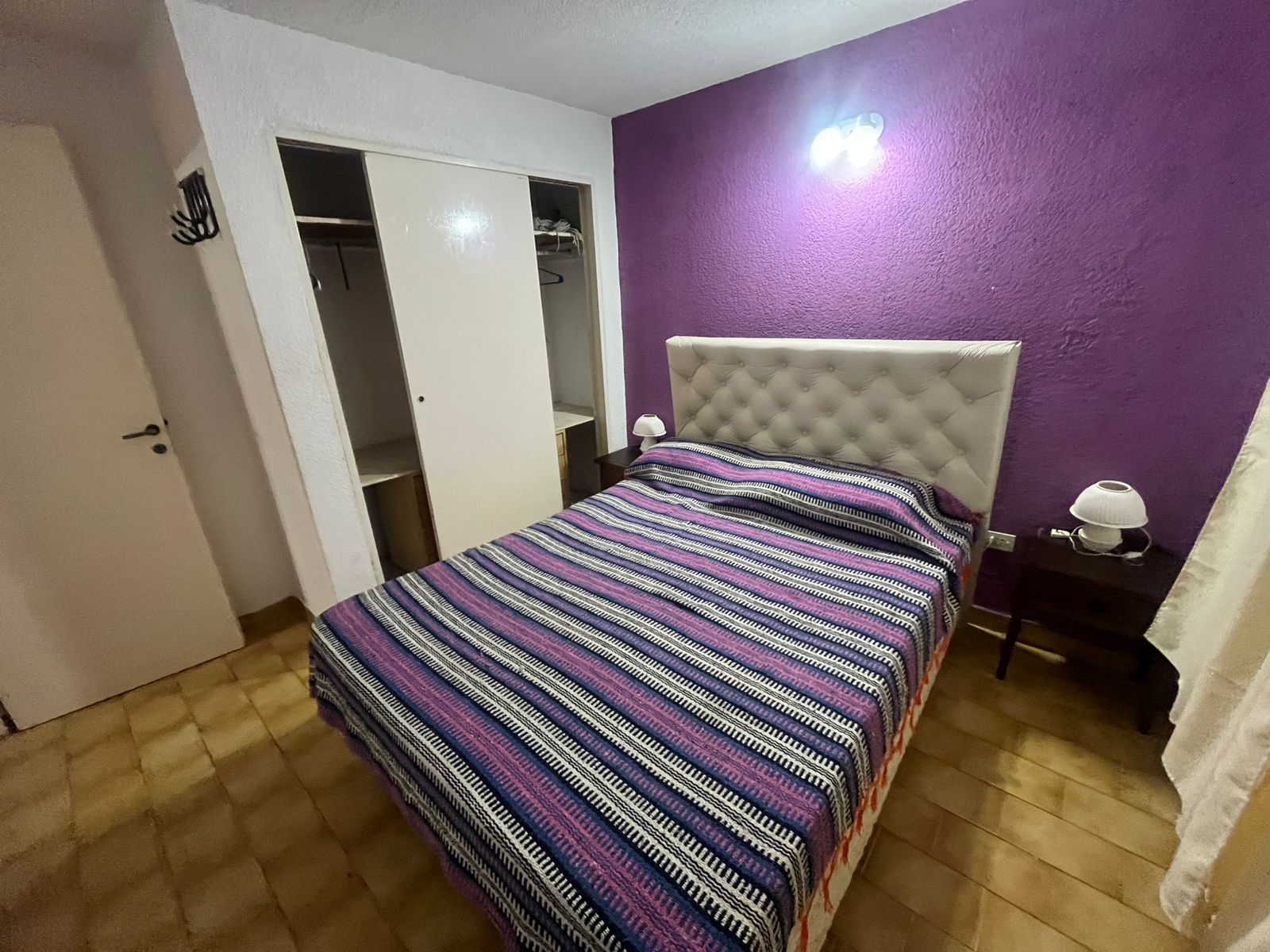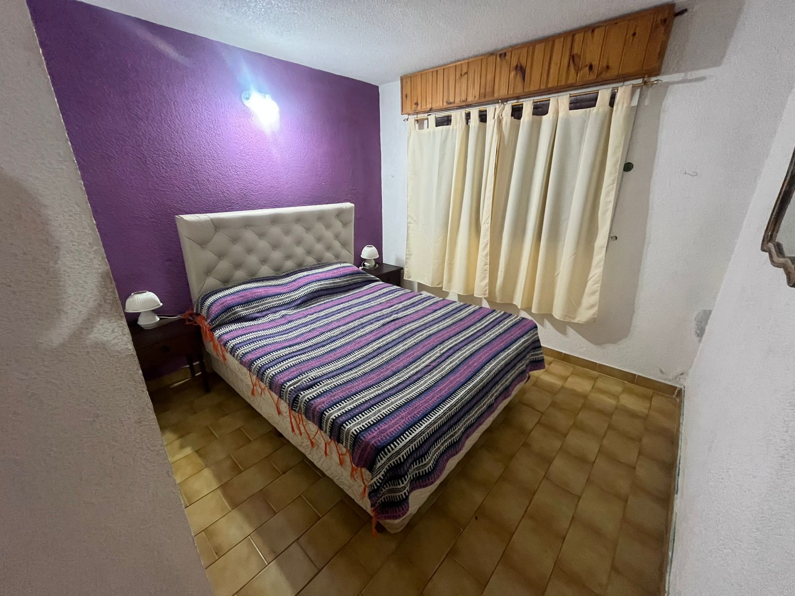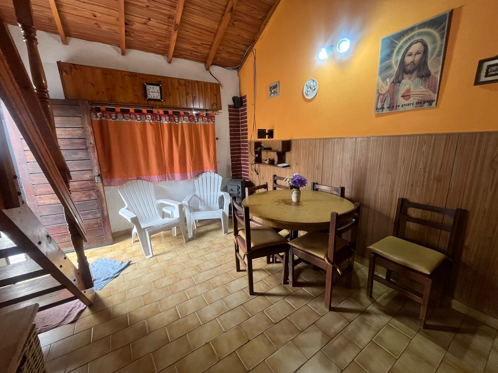 Ingresamos al complejo a través del camino vehicular común, dirigiéndonos hacia la cuarta unidad ubicada a mano izquierda. Al frente observamos un dúplex revestido con pintura látex blanco para exteriores, con una ventana orientada hacia el oeste y un zócalo de ladrillo visto de aproximadamente 30 cm de altura. Sobre el lateral derecho se encuentra el espacio vehicular correspondiente según plano, junto a un pequeño patio que dispone de parrilla. El acceso a la propiedad se realiza mediante una puerta de reja seguida de una puerta de madera. Al ingresar, nos encontramos con el ambiente principal, compuesto por un living-comedor con cocina integrada. Este sector presenta detalles en madera y paredes pintadas en color naranja, generando un ambiente cálido. Continuando desde la cocina, accedemos en primer lugar al baño completo, equipado con lavamanos, bidet, inodoro y ducha. El mismo se encuentra revestido en tonos beige, con azulejos colocados hasta el cielorraso. A continuación del baño, se ubica la habitación matrimonial enplanta baja, la cual presenta dos paredes pintadas en color blanco y una pared de acento en tono violeta en el sector del respaldo de la cama. Además, cuenta con placard embutido. Retornando al ambiente principal, hacia la derecha se encuentra una escalera de madera de pino tratada, que conduce a la habitación ubicada en el primer piso, la cual también dispone de placard embutido.