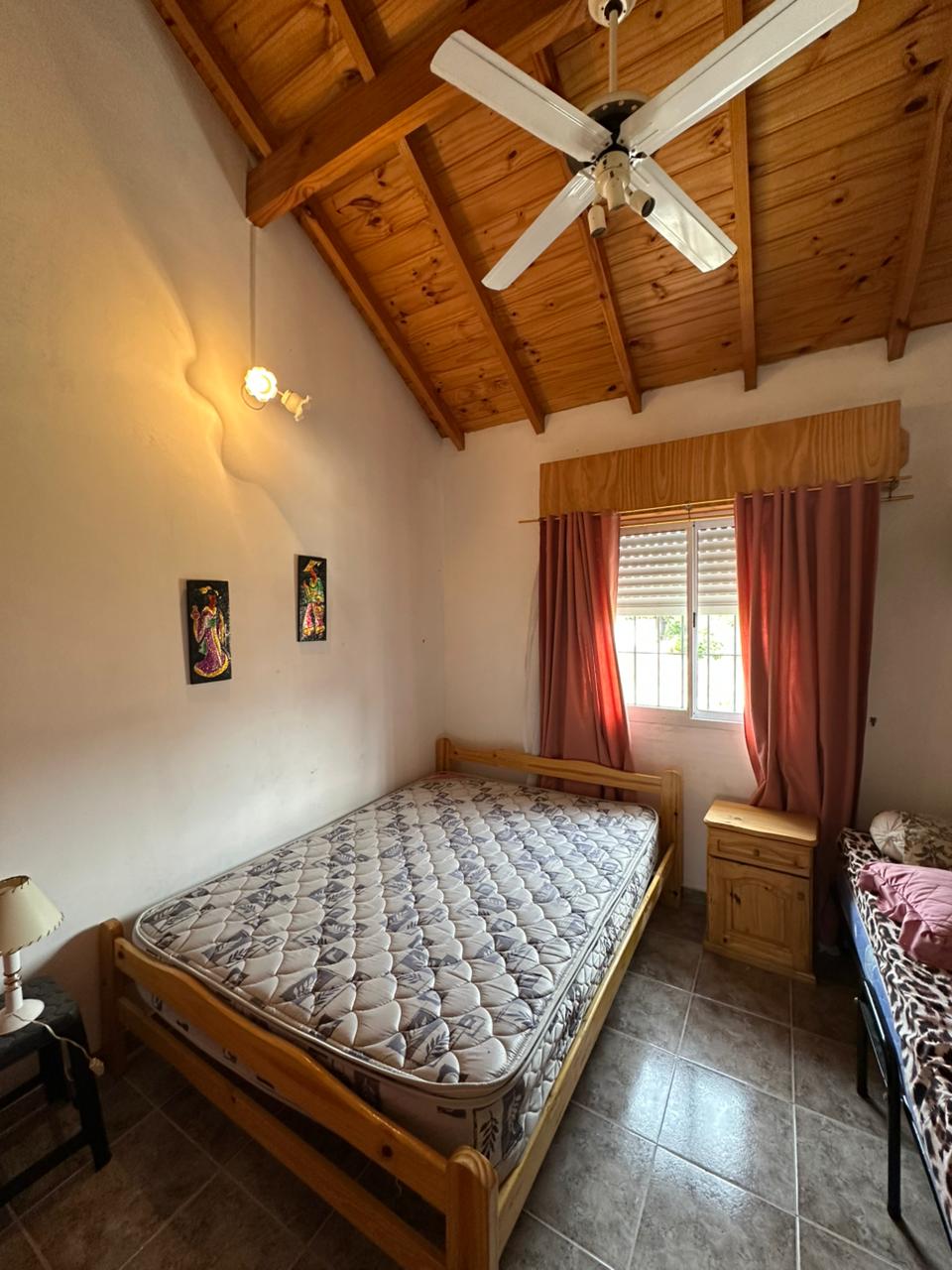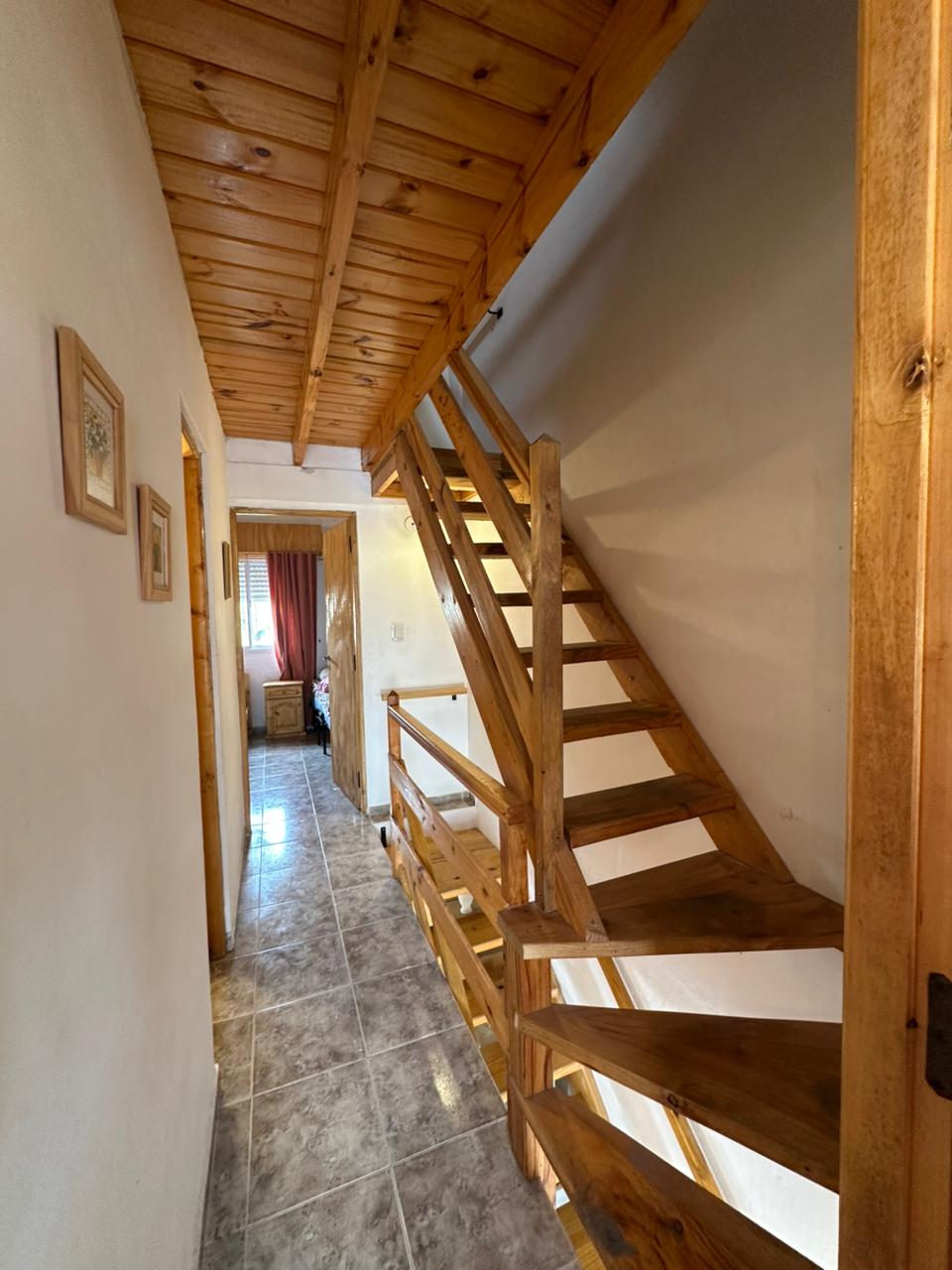 Volviendo al ingreso, por medio de una escalera de pino subimos al primer piso donde un pasillo distribuidor nos conduce primero a la habitación con vista al fondo, la cual posee un espacio de guardado propio. Después encontramos el segundo baño completo, con la misma combinación de azulejos que en planta baja pero con los colores invertidos. Más adelante se ubica la habitación matrimonial, que cuenta con placard embutido y balcón con vista al complejo.