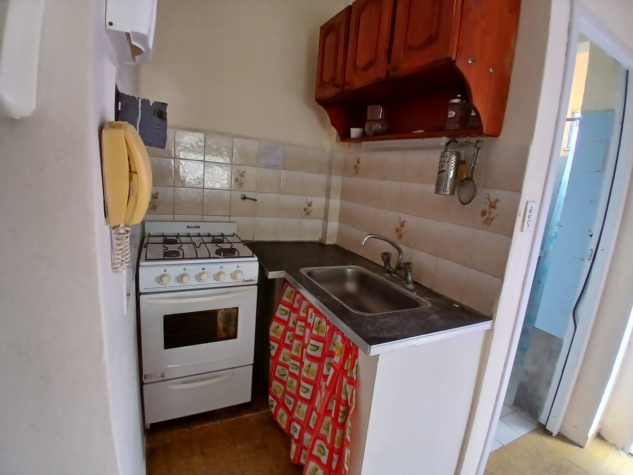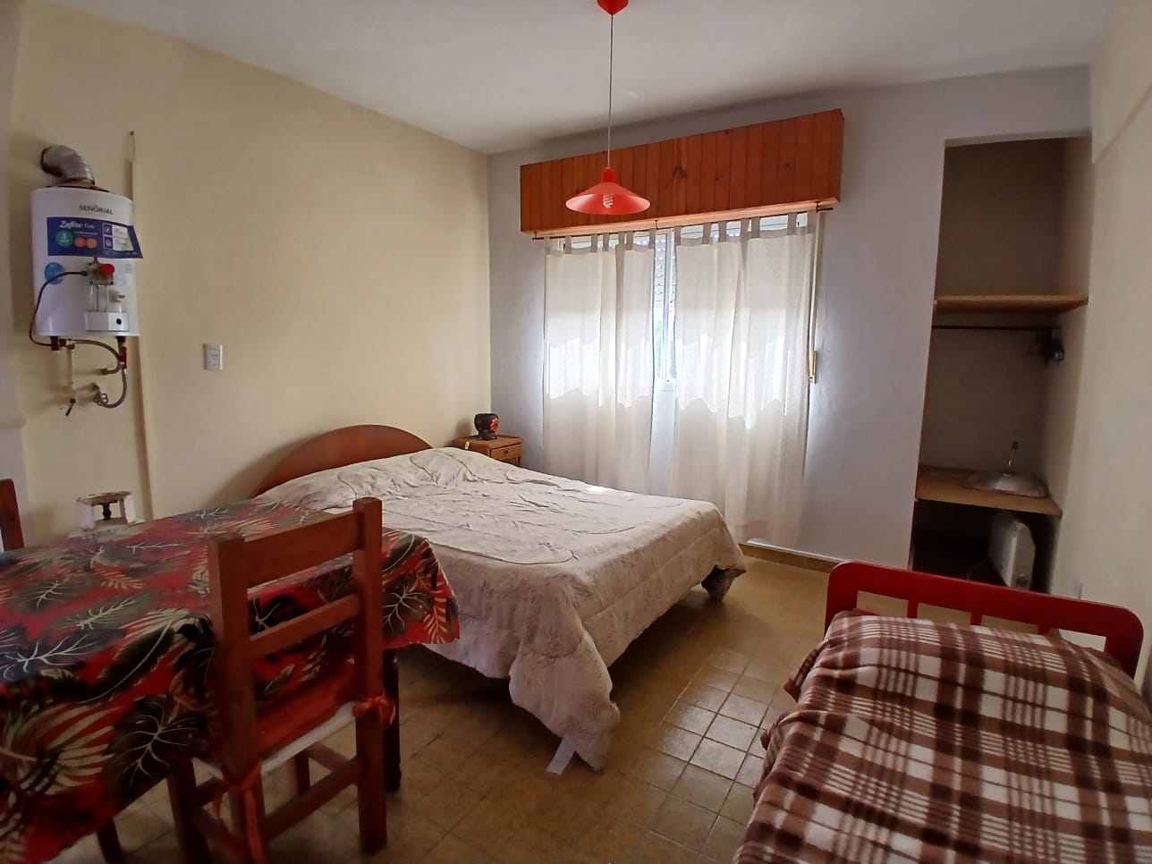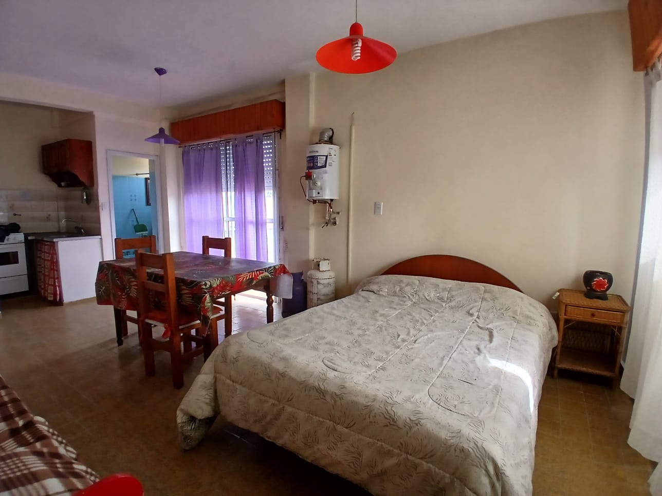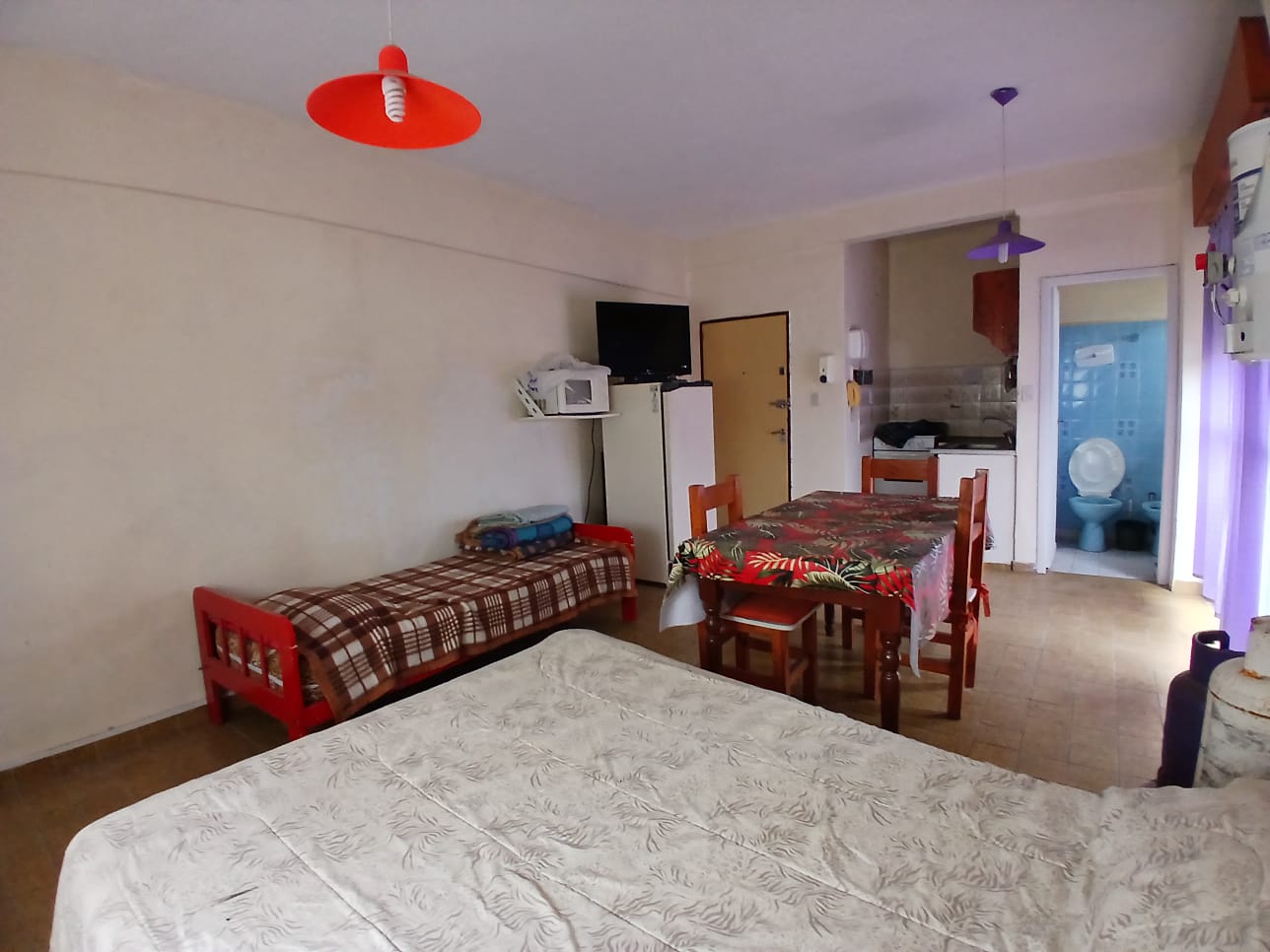 Monoambiente en 2do piso por escalera. Consta de un ambiente con cocina integrada, 1 cama de 2 pl, 1 cama de 1 pl, balcon con vista a la calle y baño. Cuenta con 1 Tv con direcTV recargable, heladera con congelador, microondas, 1 ventilador y gas envasado (a cargo inq). No acepta Mascota